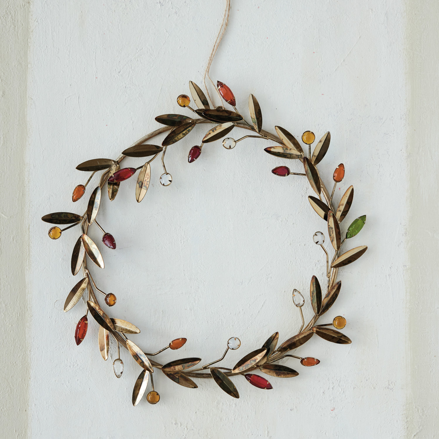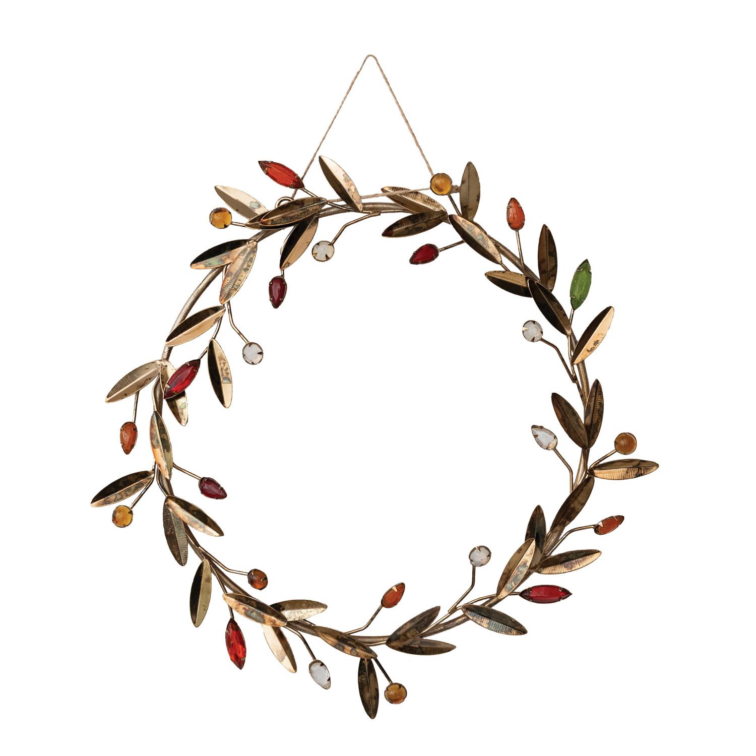 Catalog Name: 12-1/2" Round Metal Leaves & Acrylic Bead Berries Wreath, Antique Gold Finish & Multi Color