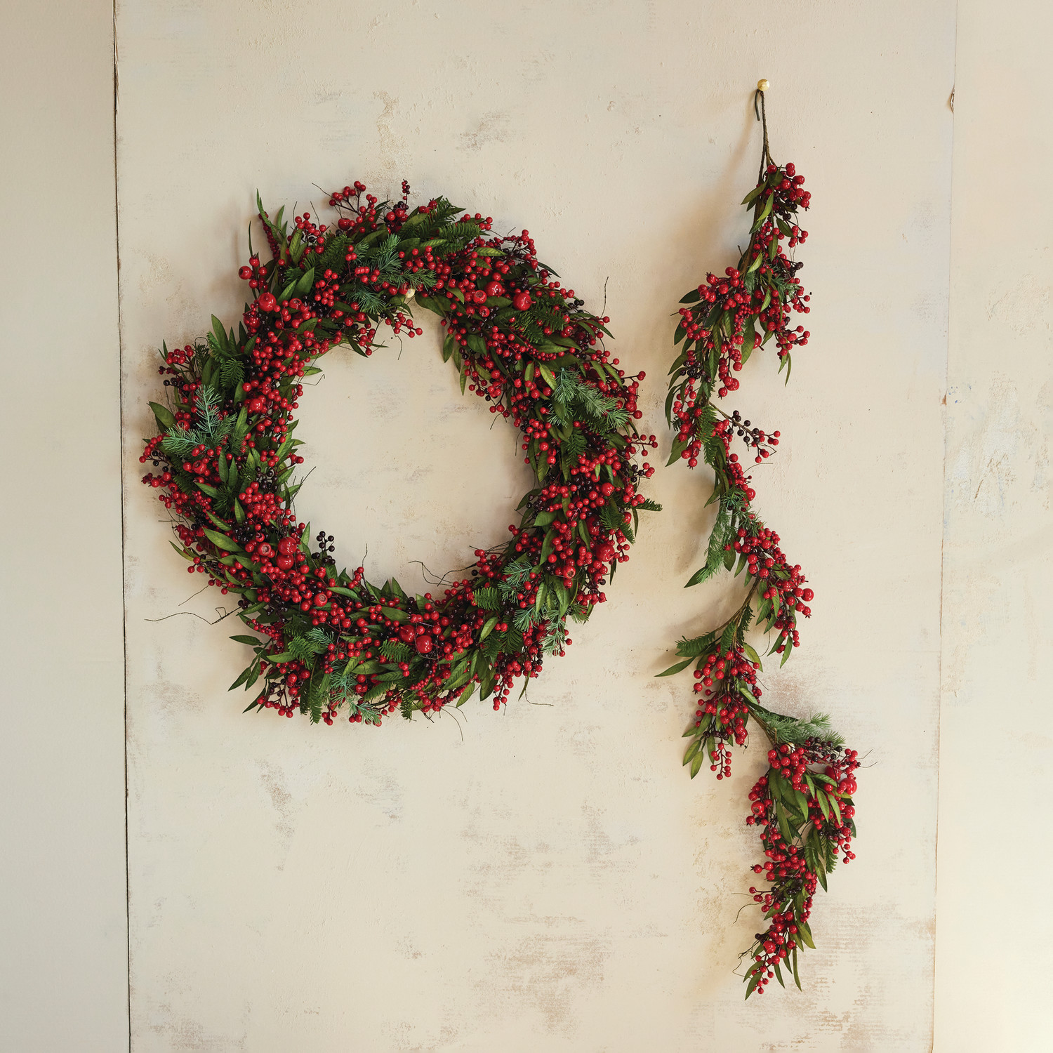 Faux Spruce Wreath with Red Berries, Crab Apples & Pinecones