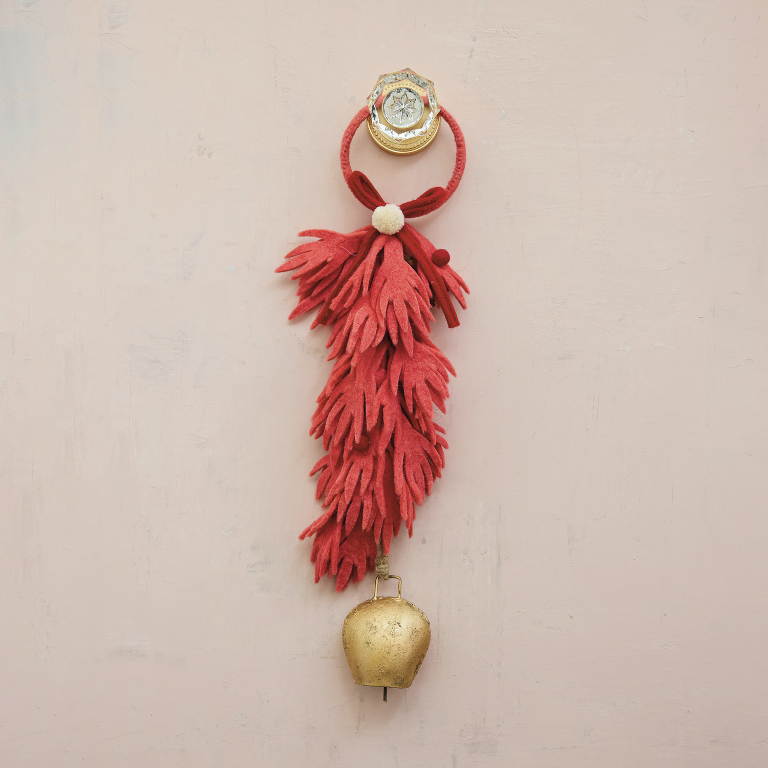 Catalog Name: 4"W x 20-1/2"H Handmade Wool Felt Leaves & Berries Door Hanger w/ Metal Bell, Multi Color