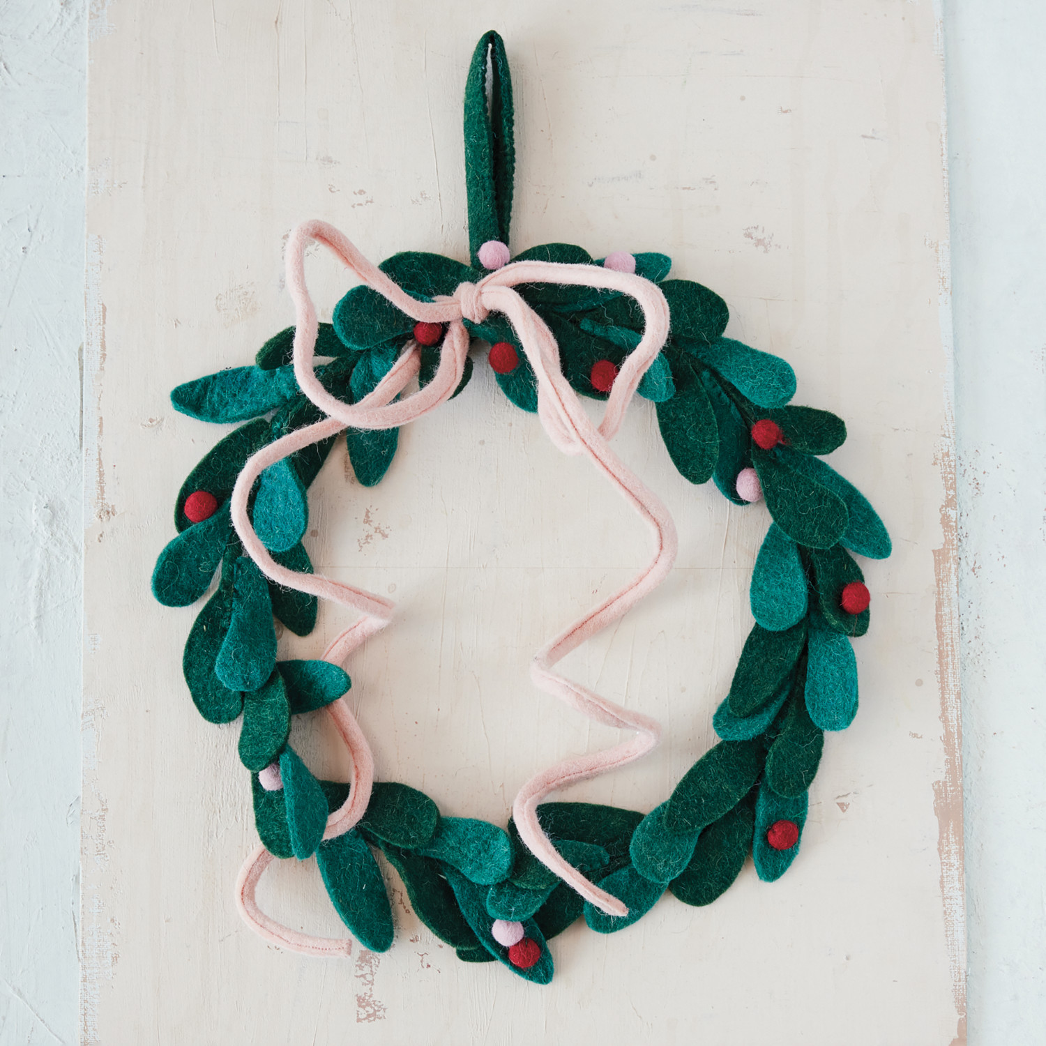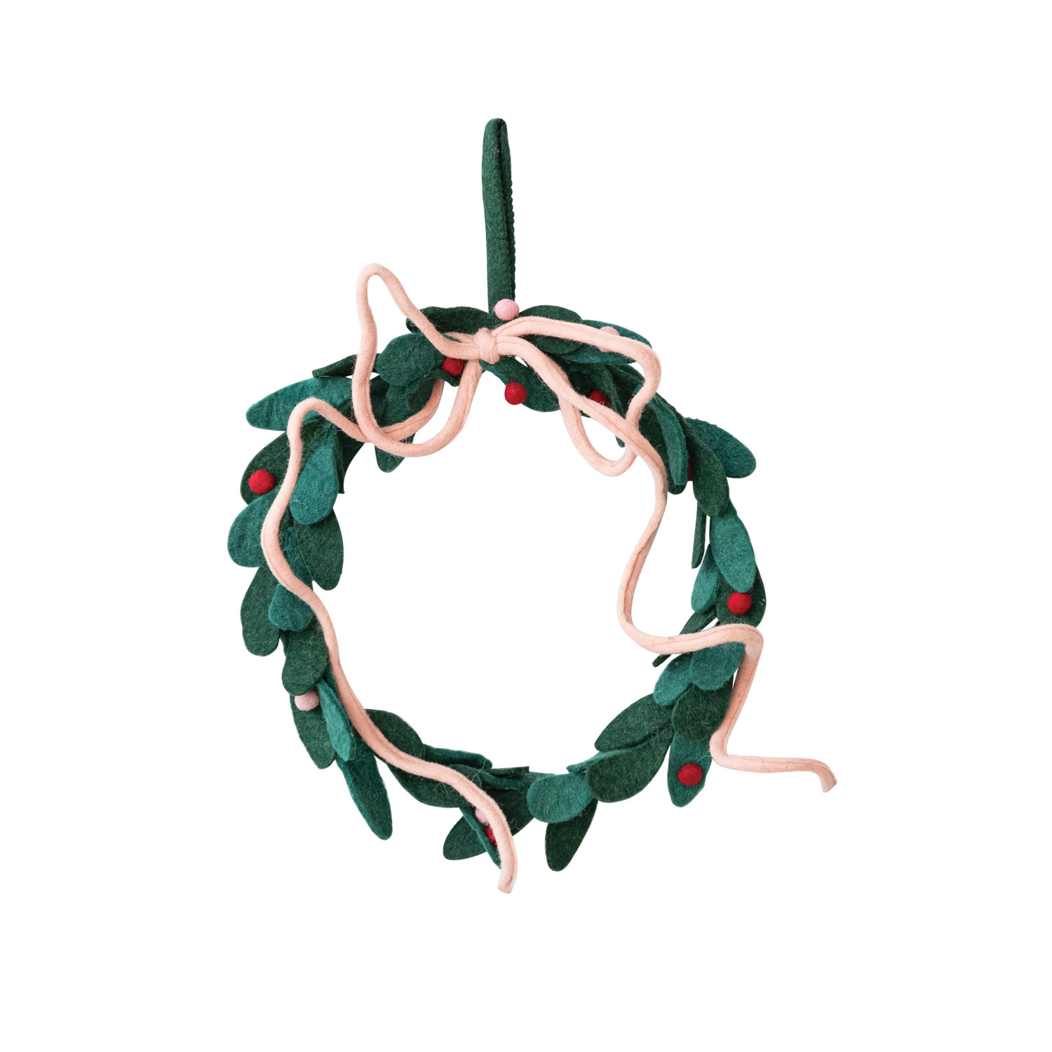 Handmade Wool Felt Leaves Wreath with Wired Bow & Berries