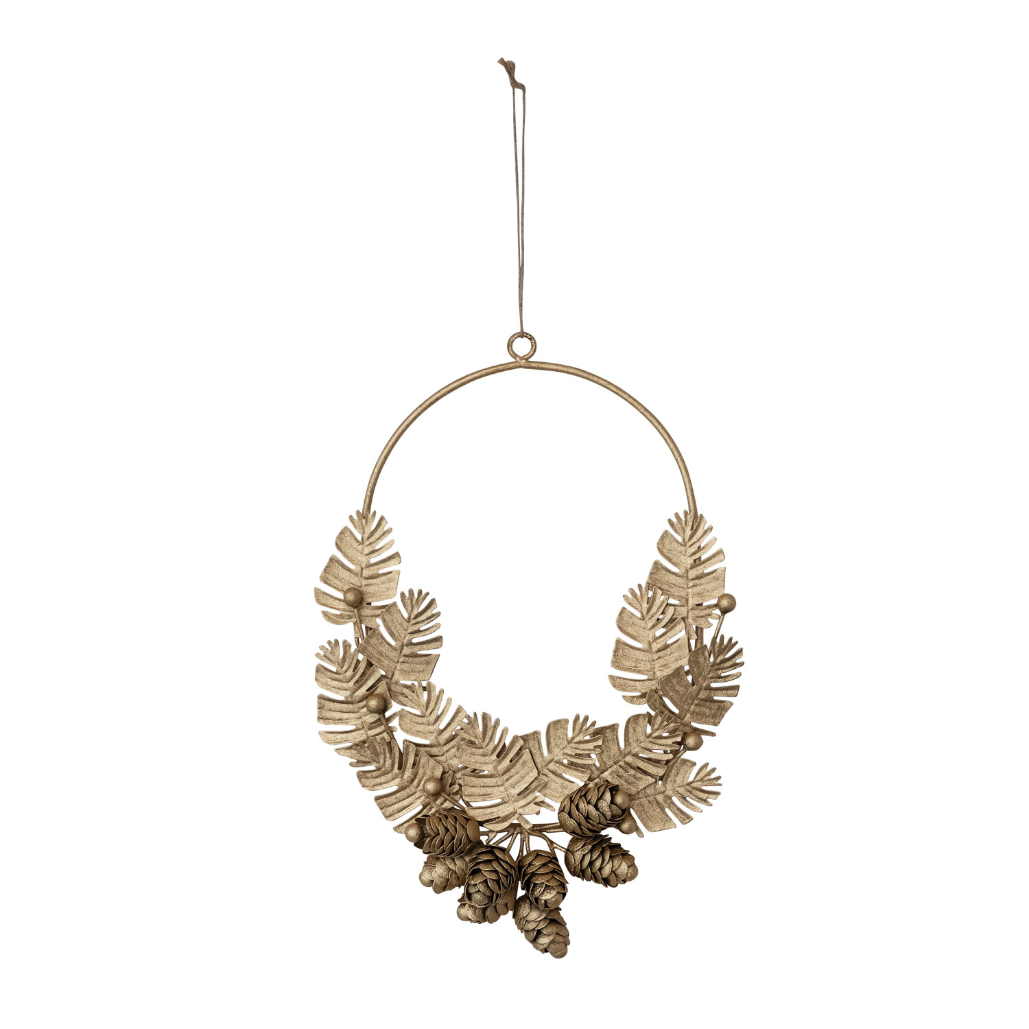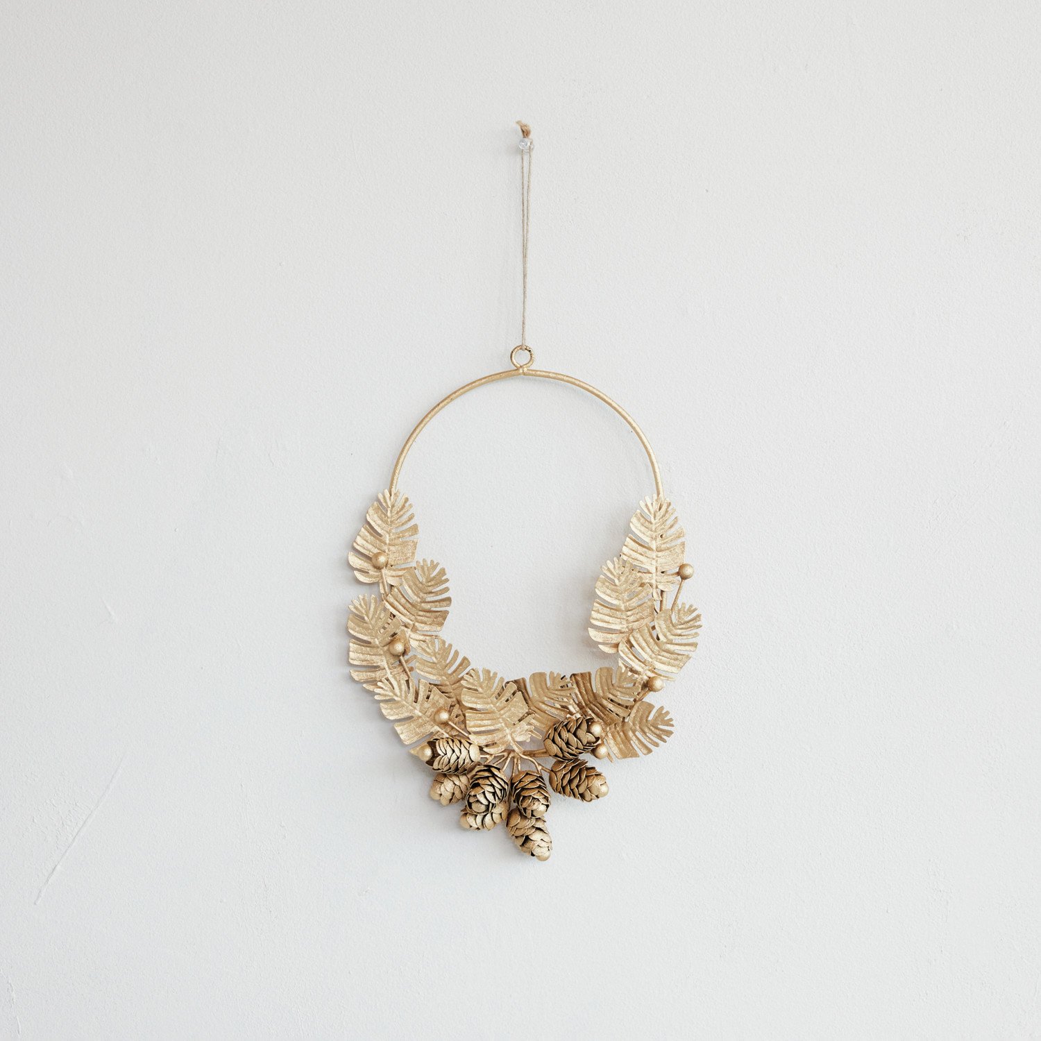 Metal Leaves Wreath with Pinecones, Antique Gold Finish