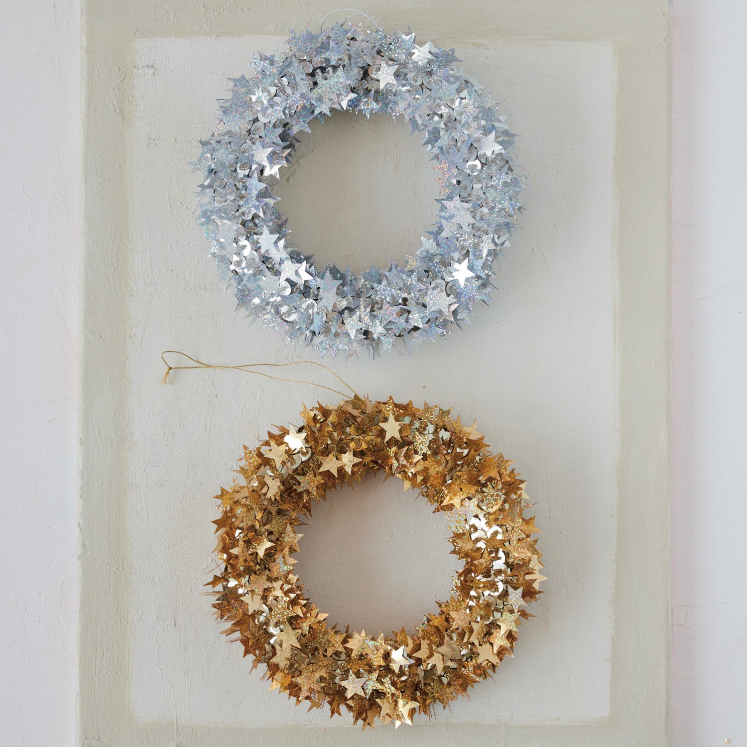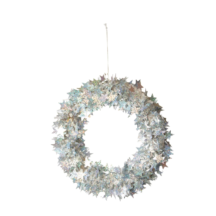 Catalog Name: 8-3/4" Round Handmade Holographic Tinsel Star Wreath, Silver Finish