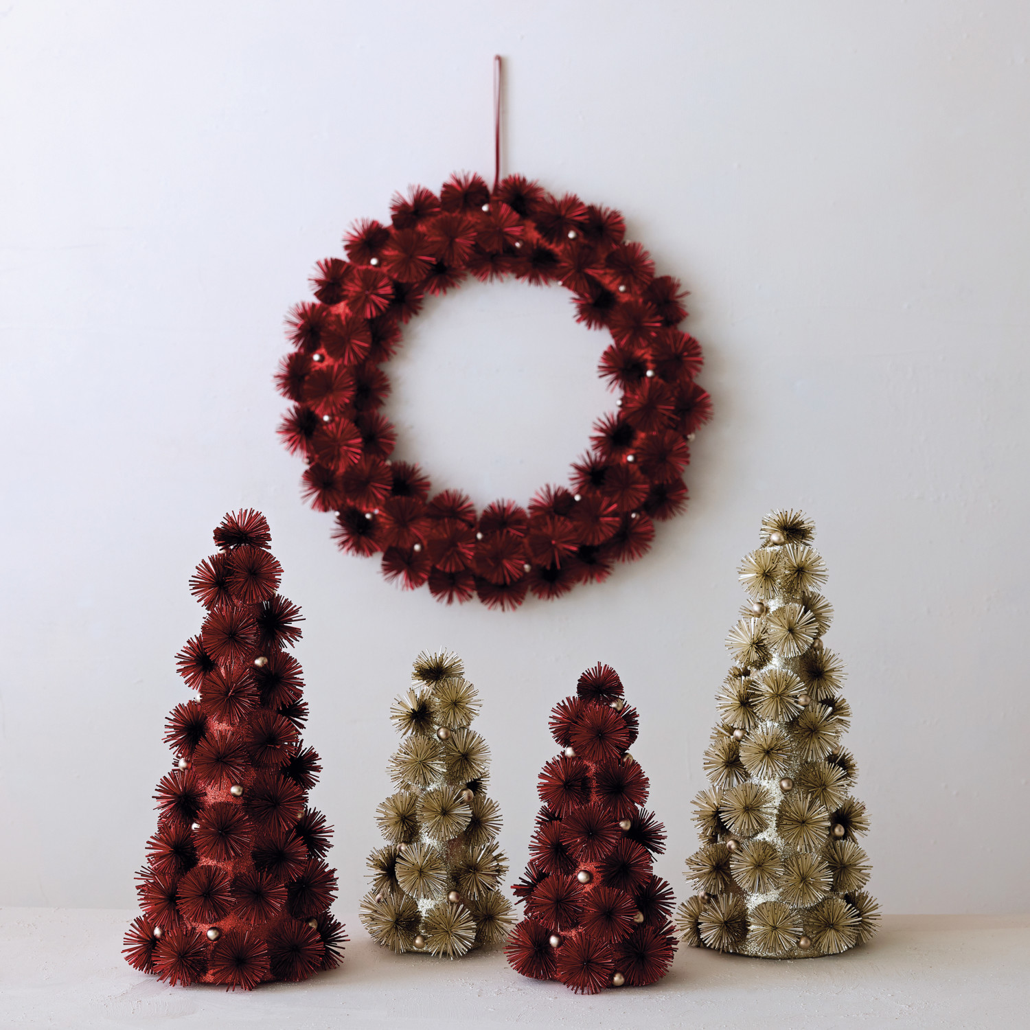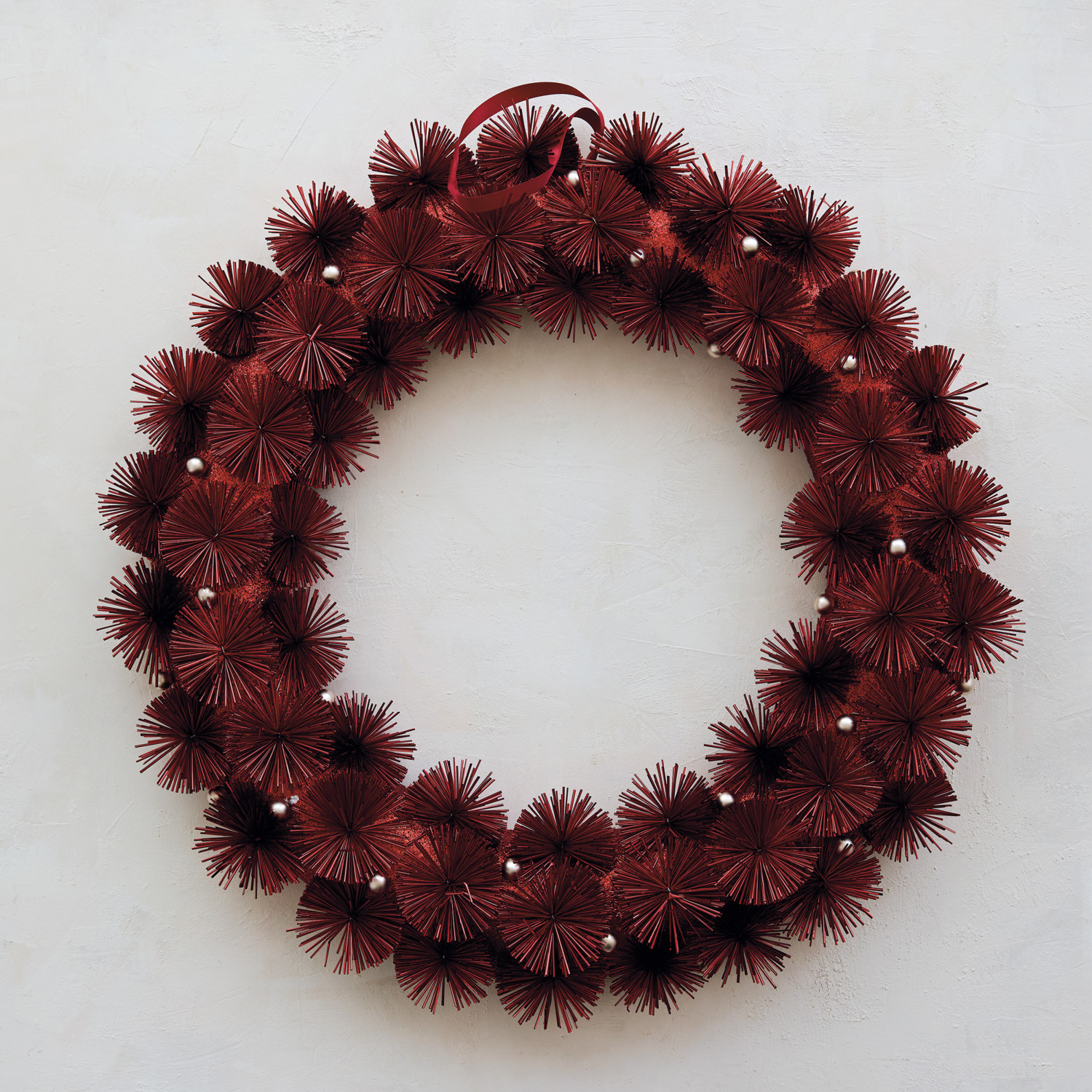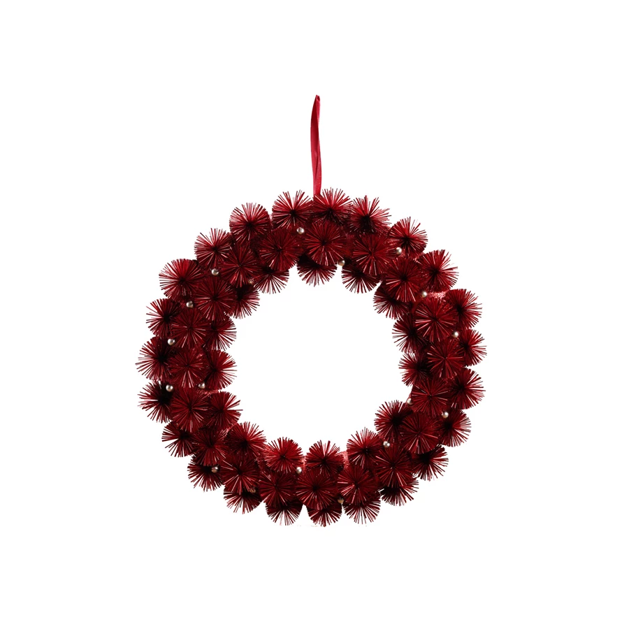 Plastic Tinsel Ball Wreath with Glitter & Silver Color Beads, Red
