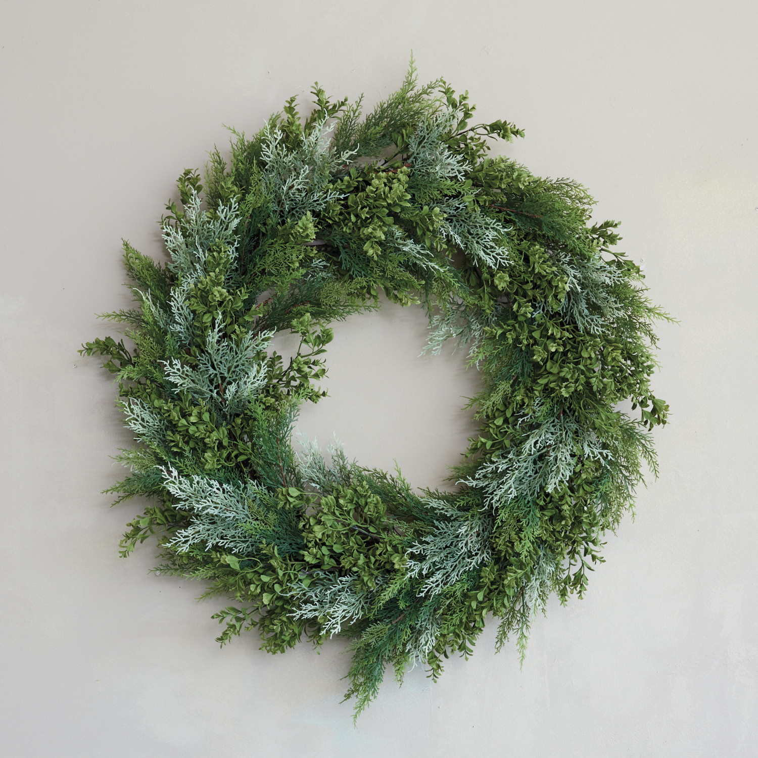 Faux Boxwood, Cedar & Juniper Wreath, Frost Finish