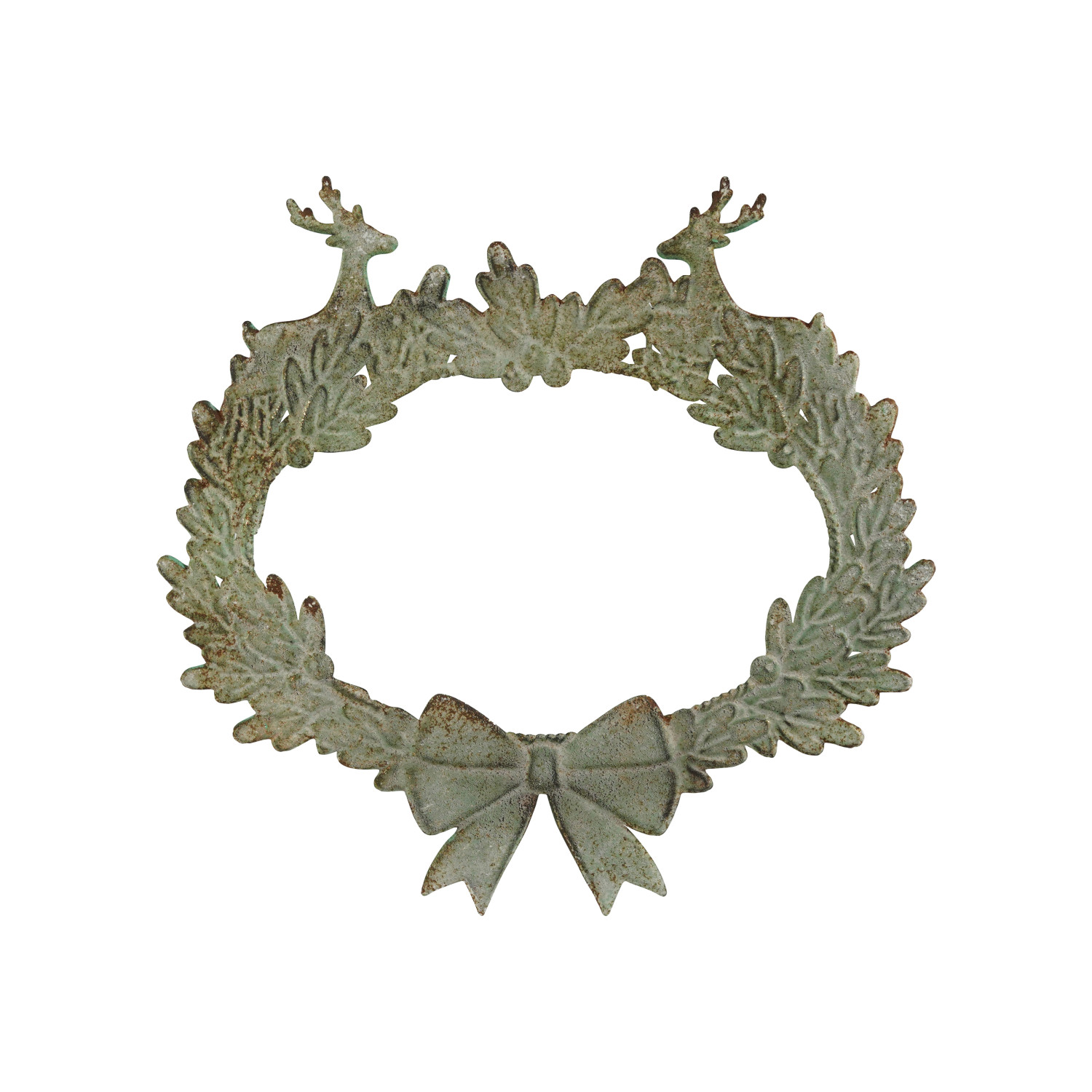Catalog Name: 19-1/2"W x 19"H Oval Embossed Metal Wreath Wall Décor w/ Deer & Bow, Distressed Patina Finish