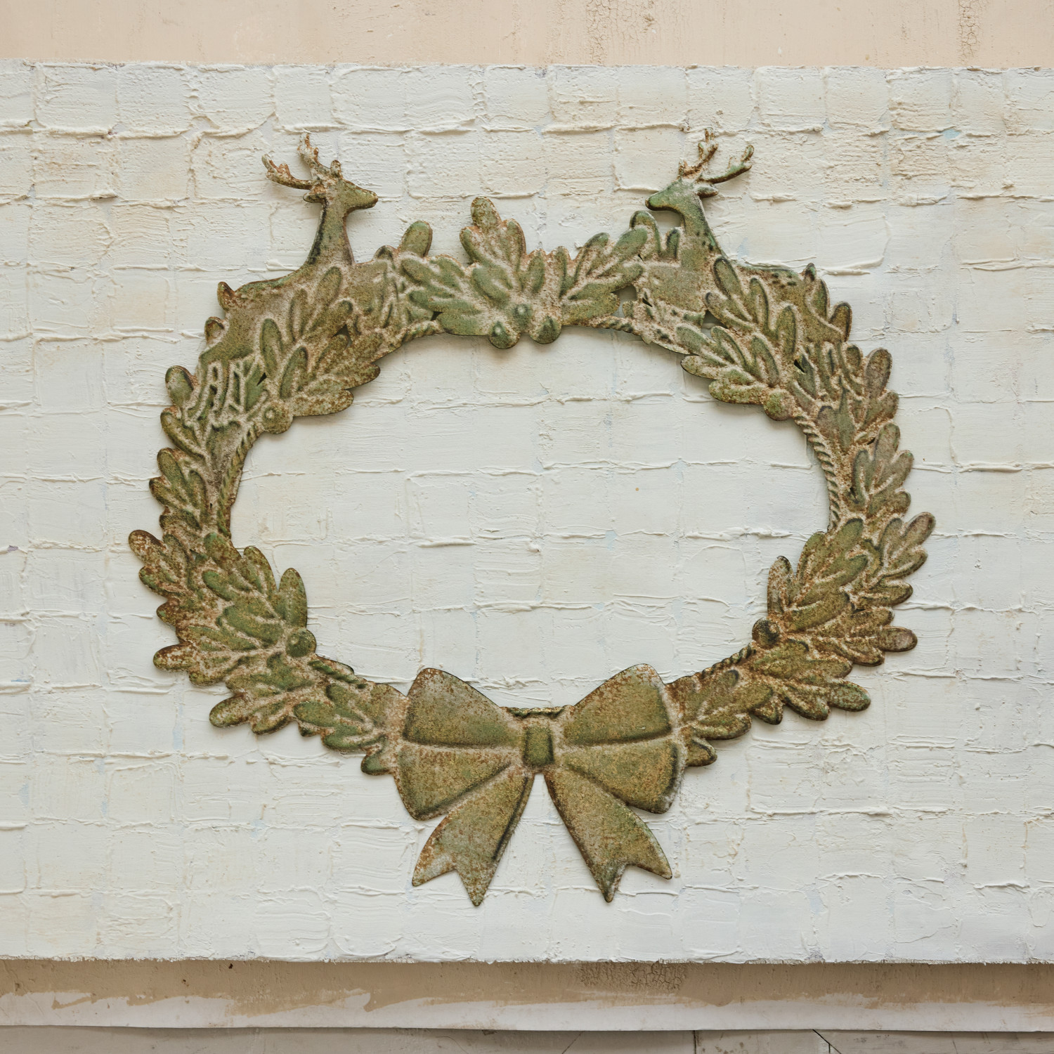 Embossed Metal Wreath Wall Decor with Deer & Bow, Distressed Patina Finish