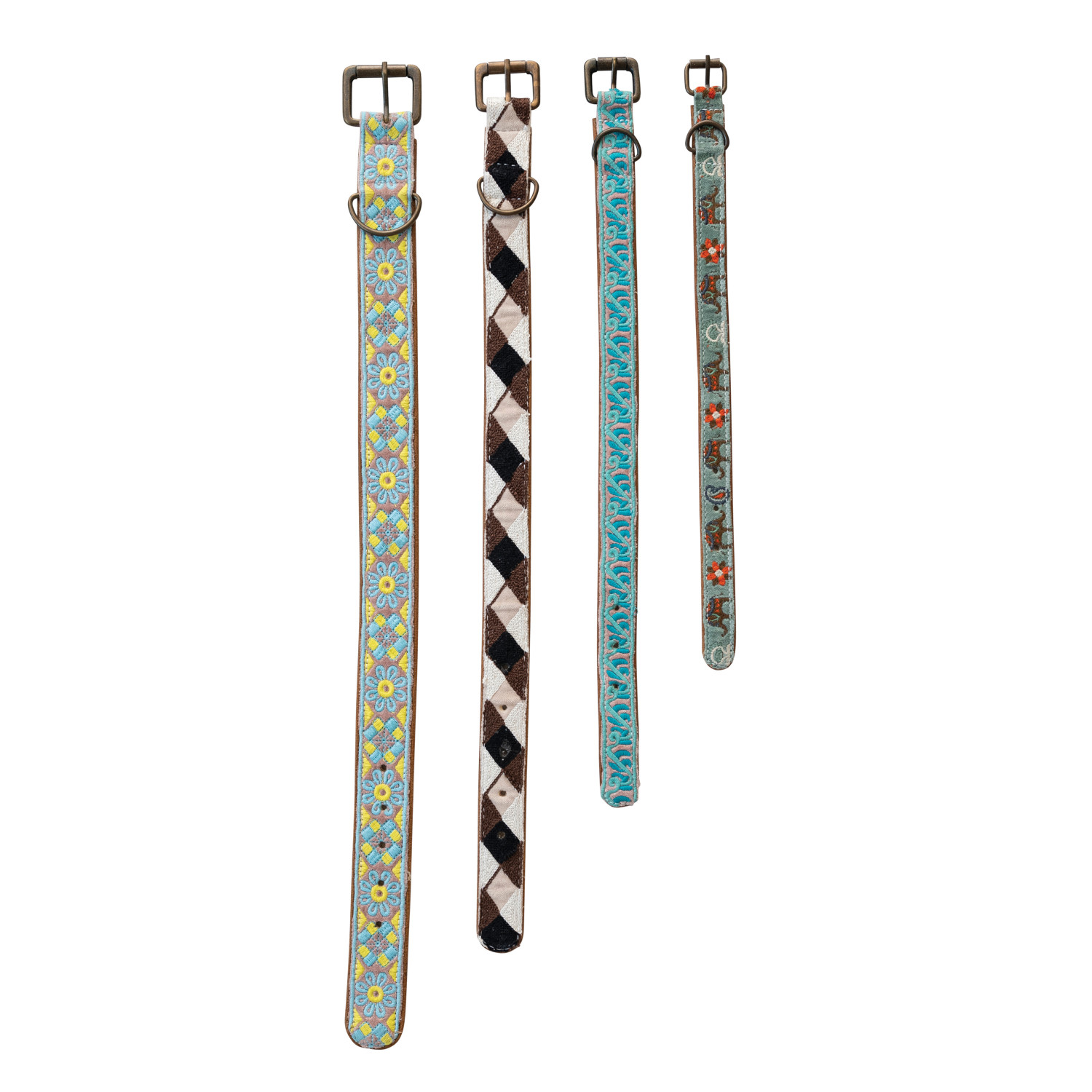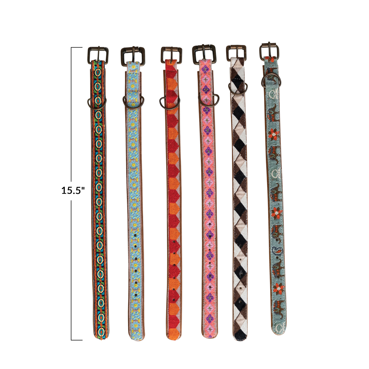Catalog Name: 15-1/2"L x 1"W Cotton & Leather Dog Collar w/ Embroidery & Metal Buckle, Multi Color, 6 Styles, Extra Small