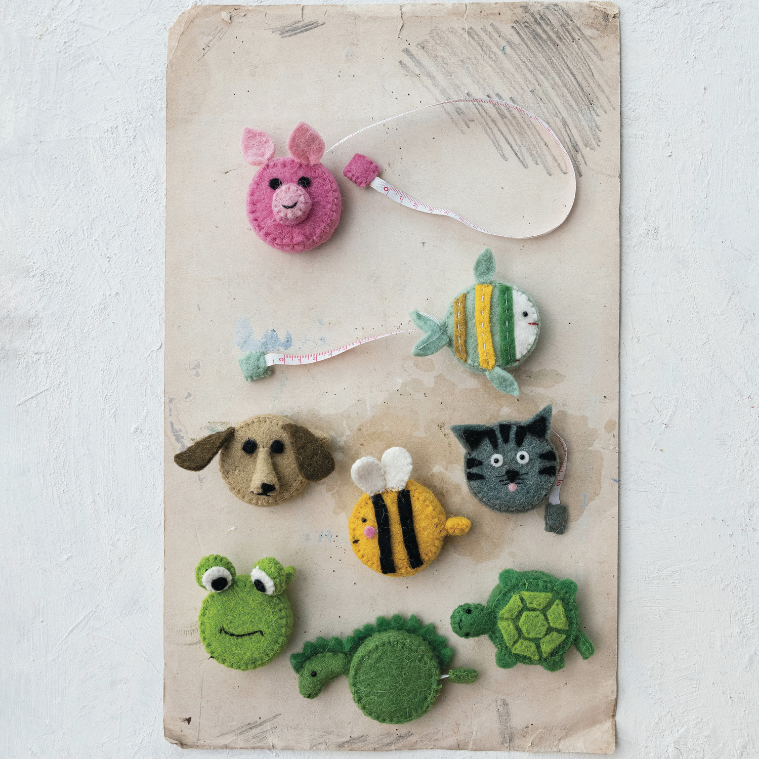 Catalog Name: 2-1/4"L Handmade Embroidered Wool Felt Animal Shaped Tape Measure, Multi Color, 8 Styles (Each Measures 5 Feet)