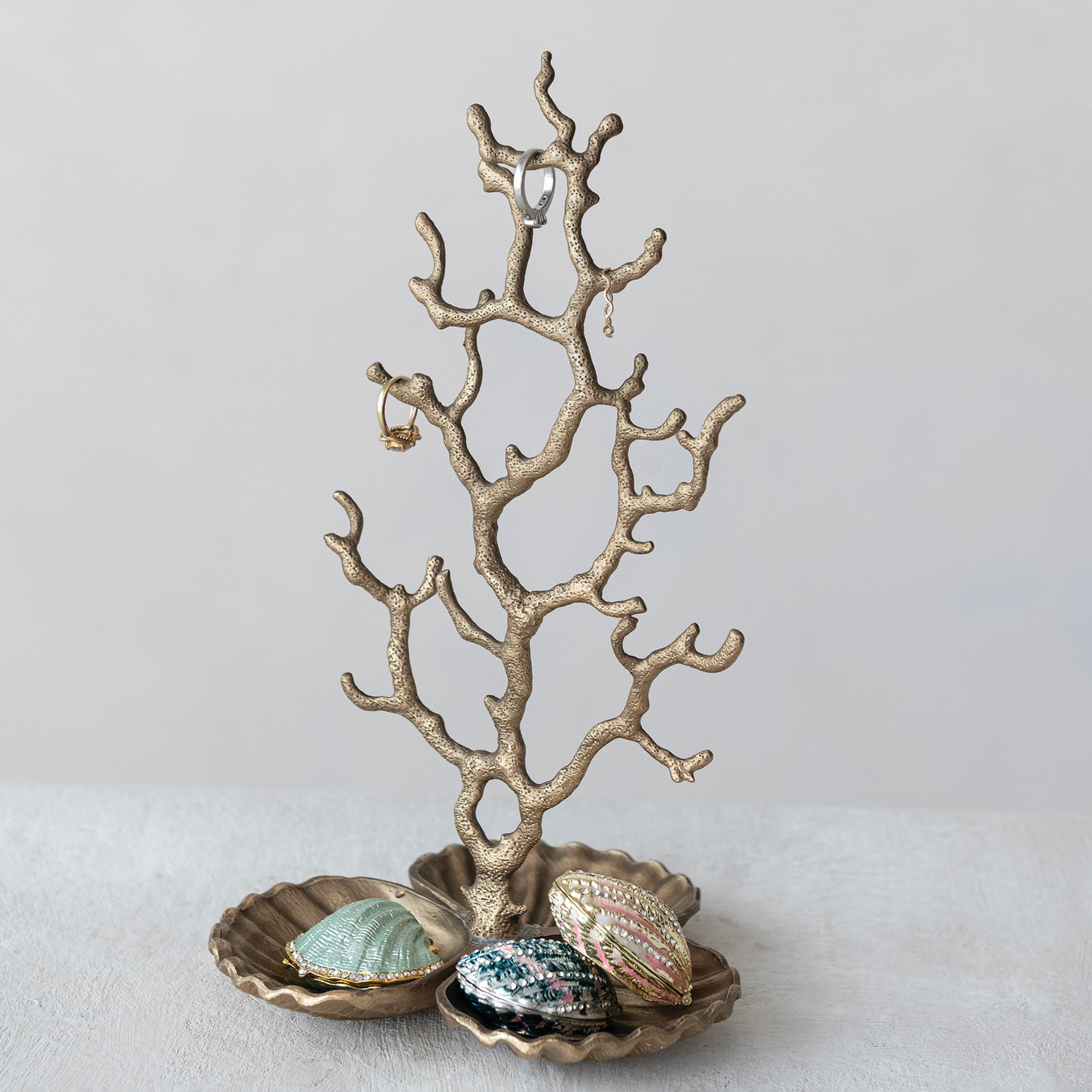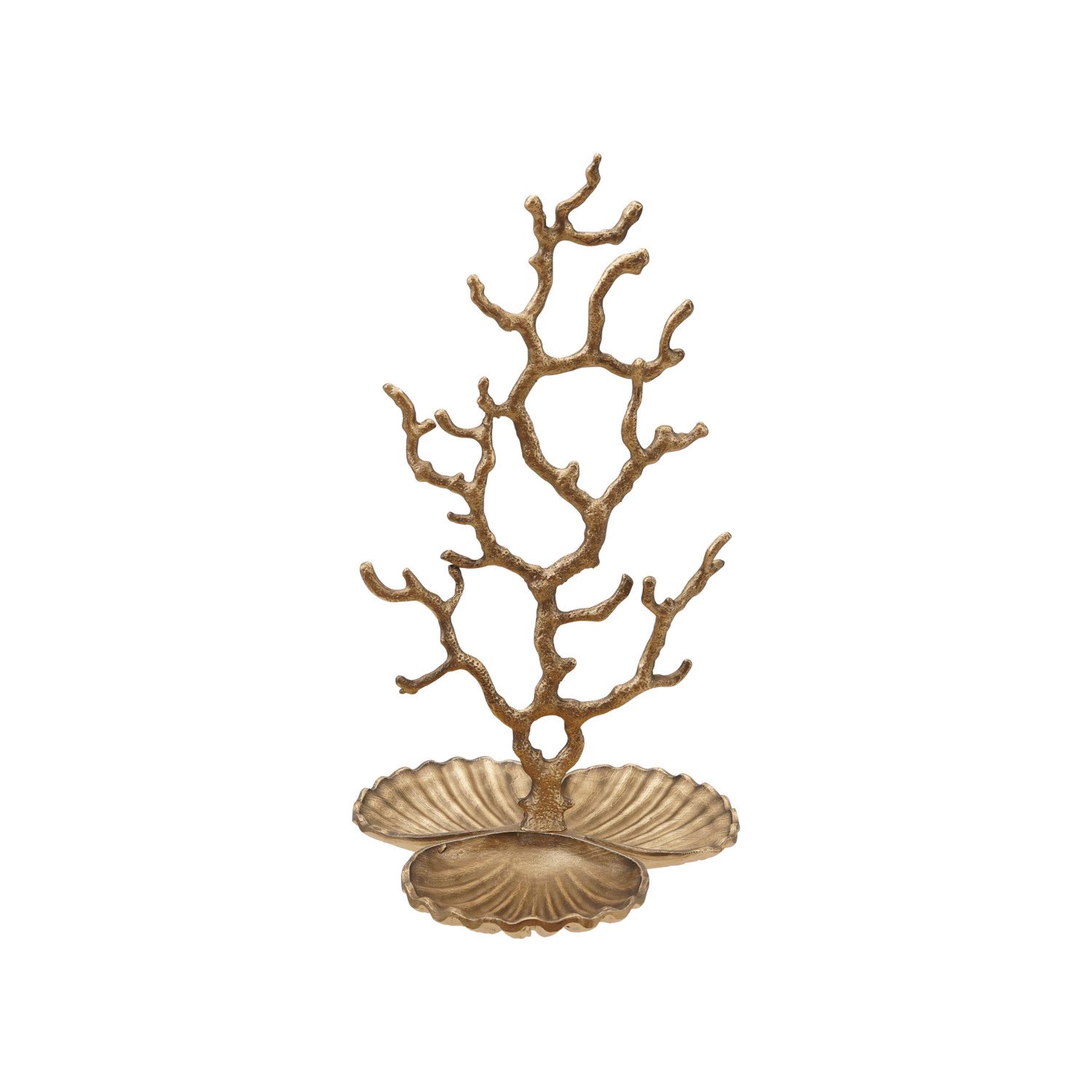 Catalog Name: 6-1/2"L x 6-1/4"W x 11-1/2"H Metal Coral Shaped Jewelry Holder w/ Shell Shaped Base & 3 Sections, Antique Brass Finish