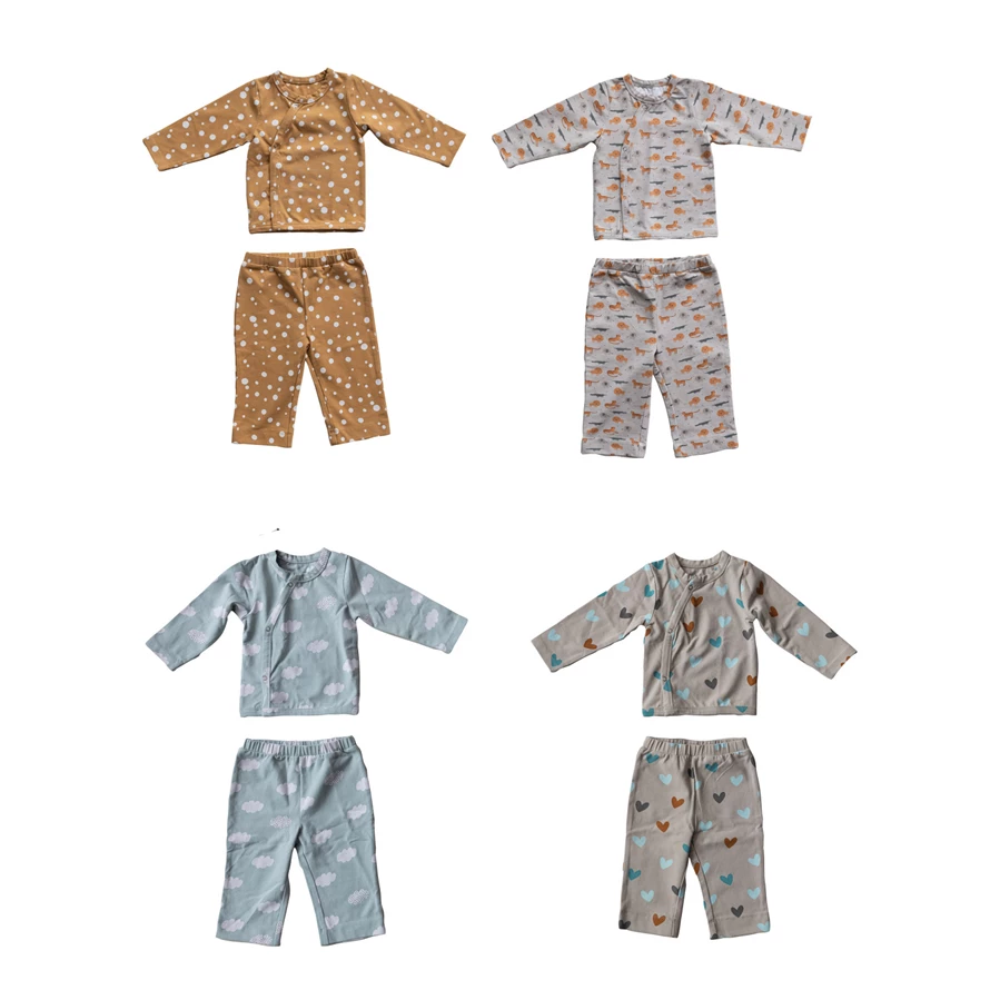 Catalog Name: Cotton Blend Printed Long Sleeve Baby Kimono Top w/ Snaps, Pattern & Matching Pants, Multi Color, Set of 2, 4 Styles (6-9 Months, 9-12 Months)