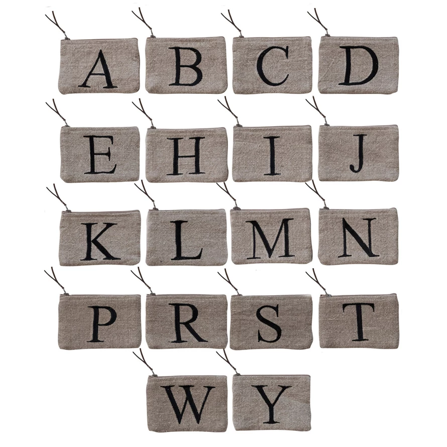 Catalog Name: 6"L x 4"H Woven Linen Zip Pouch w/ Embroidered Monogram Letter & Leather Tassel, Natural & Black, 18 Styles (Assortment Includes All Letters Except O, F, G, Q, U, V, X & Z)