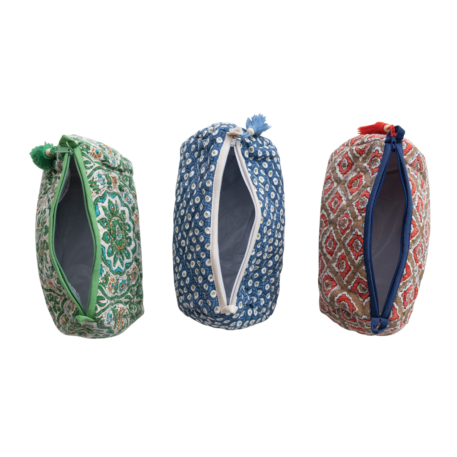 Catalog Name: 9"L x 4-1/2"W x 4-1/2"H Quilted Cotton Slub Printed Zip Pouch w/ Block Print Pattern, Interior Lining, Wood Bead & Tassel, Multi Color, 3 Styles
