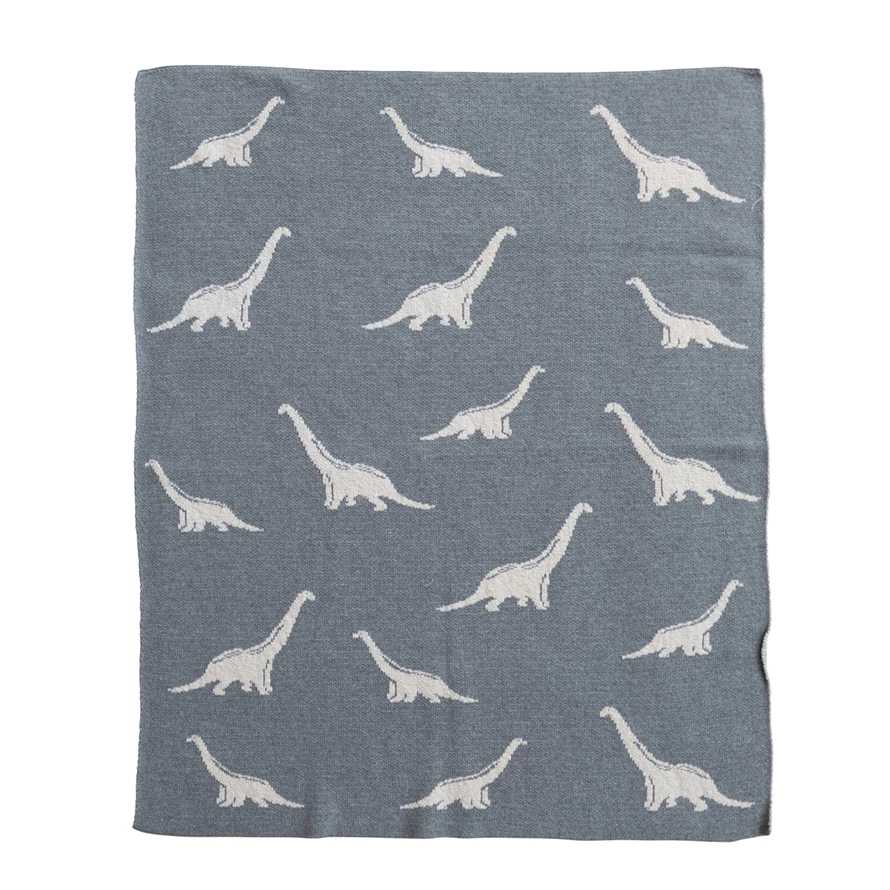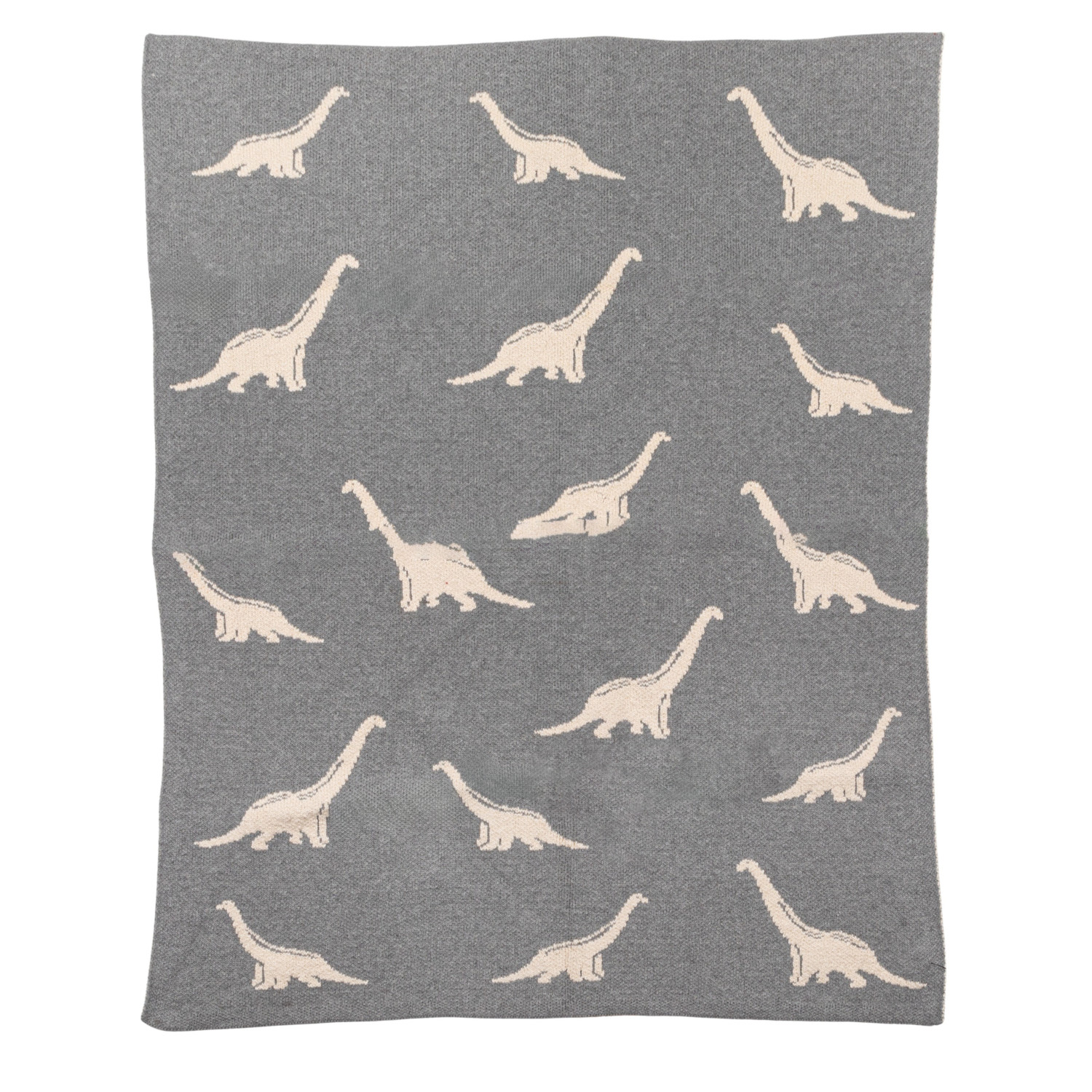 Cotton Knit Baby Blanket with Dinosaurs, Light Grey & Natural