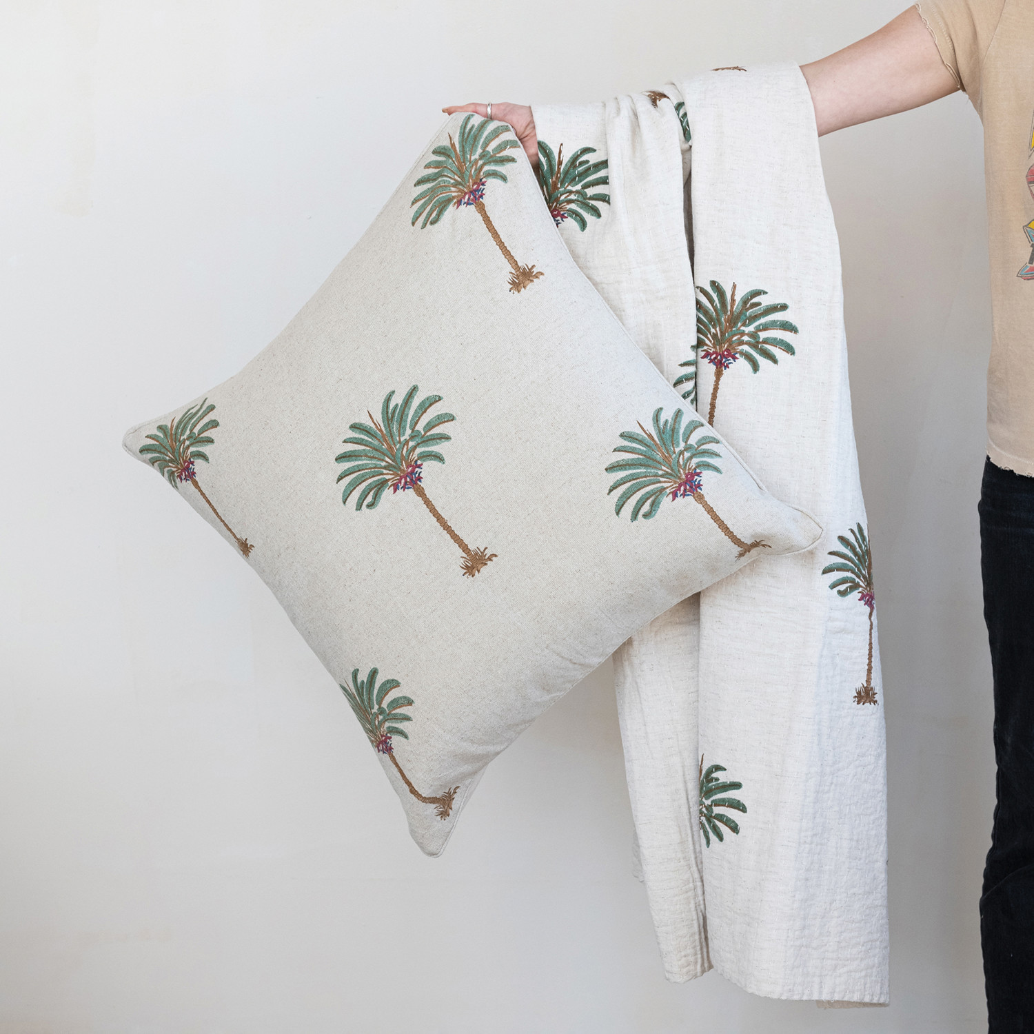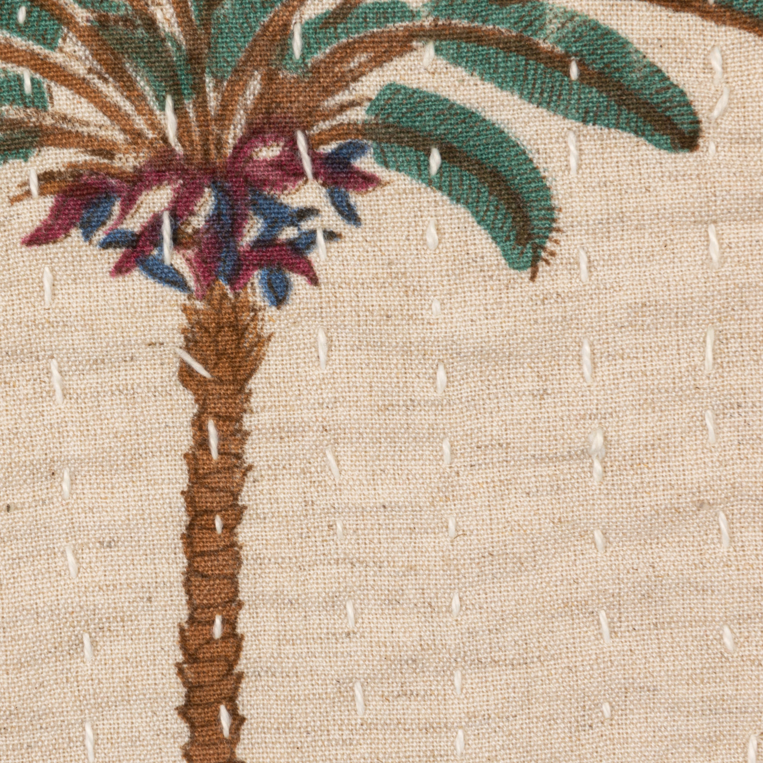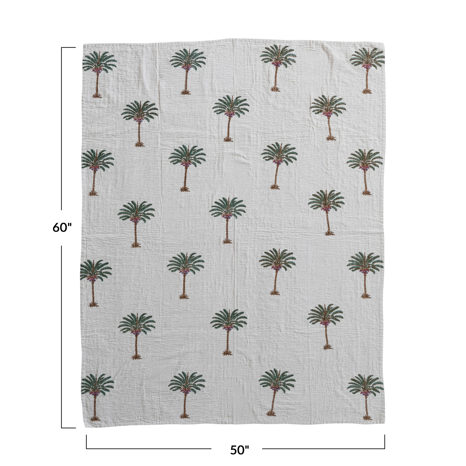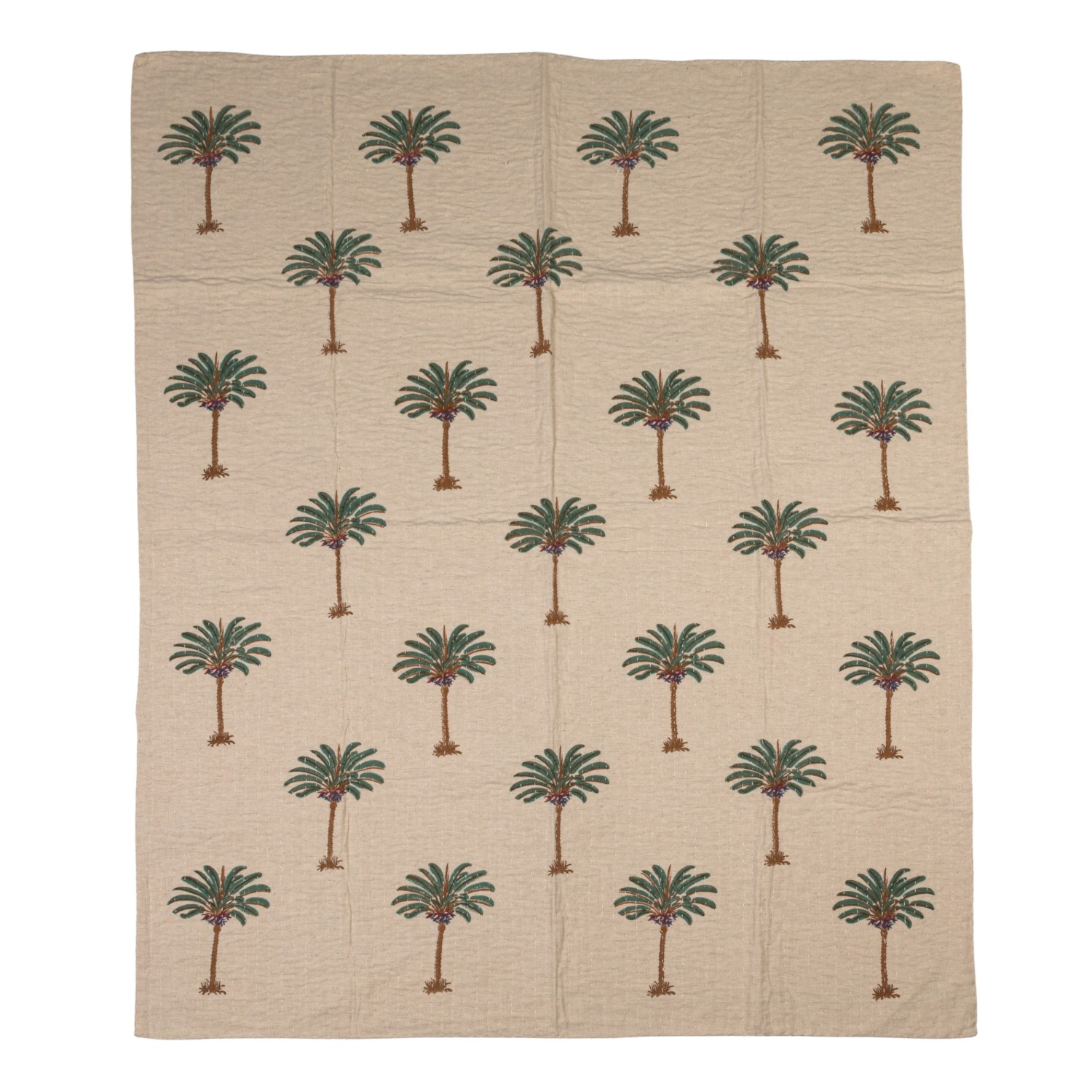 Catalog Name: 60"L x 50"W Cotton & Linen Block Printed Throw w/ Palm Trees & Hand-Embroidered Kantha Stitch, Natural, Green & Brown