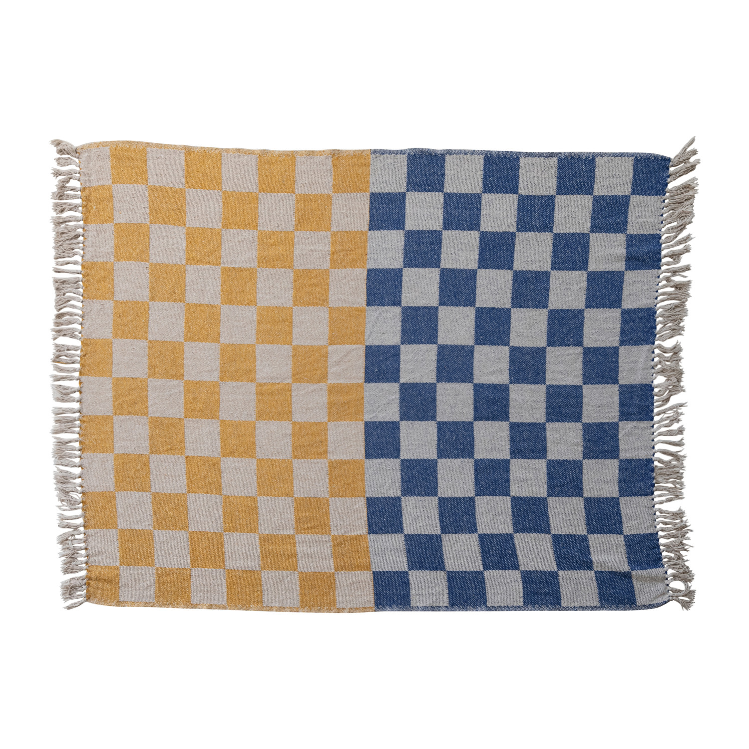 Catalog Name: 60"L x 50"W Woven Recycled Cotton Blend Throw w/ Check Pattern & Fringe, Yellow, Blue & Natural