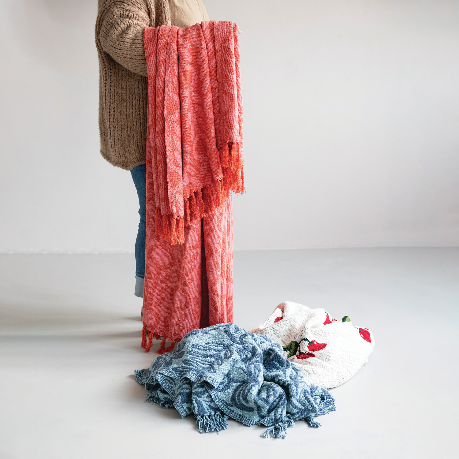 Catalog Name: 60"L x 50"W Woven Recycled Cotton Blend Jacquard Throw w/ Floral Pattern & Fringe, Pink & Red