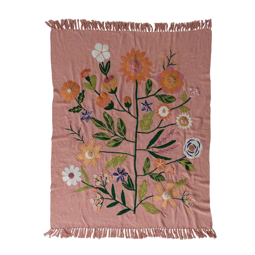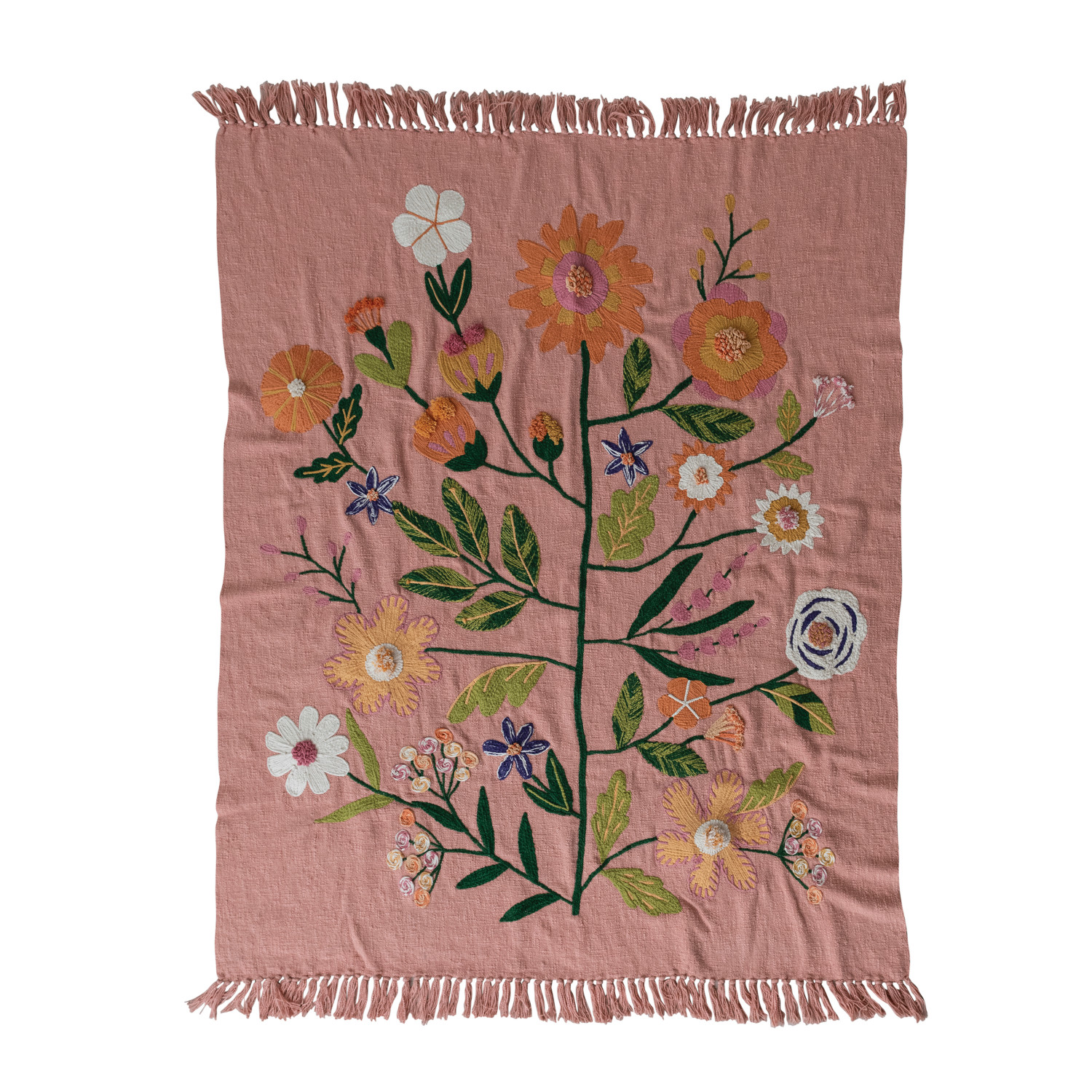 60"L x 50"W Woven Cotton Throw with Embroidered Flowers & Fringe