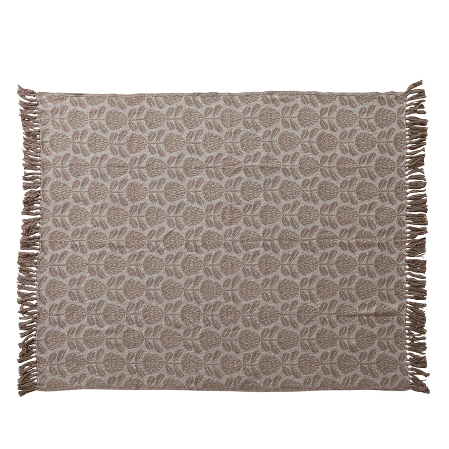 60"L x 50"W Woven Recycled Cotton Blend Jacquard Throw with Floral Pattern & Fringe