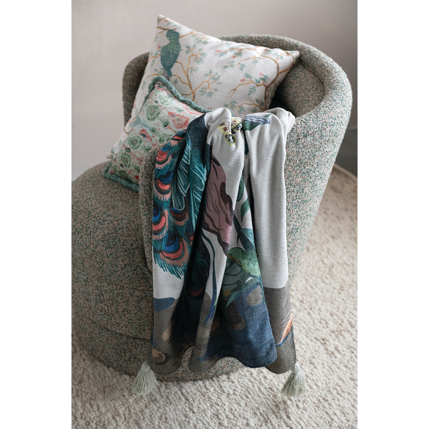 60"L x 50"W Fabric Blend Chenille Throw with Peacock, Birds, Butterfly, Botanicals & Tassels