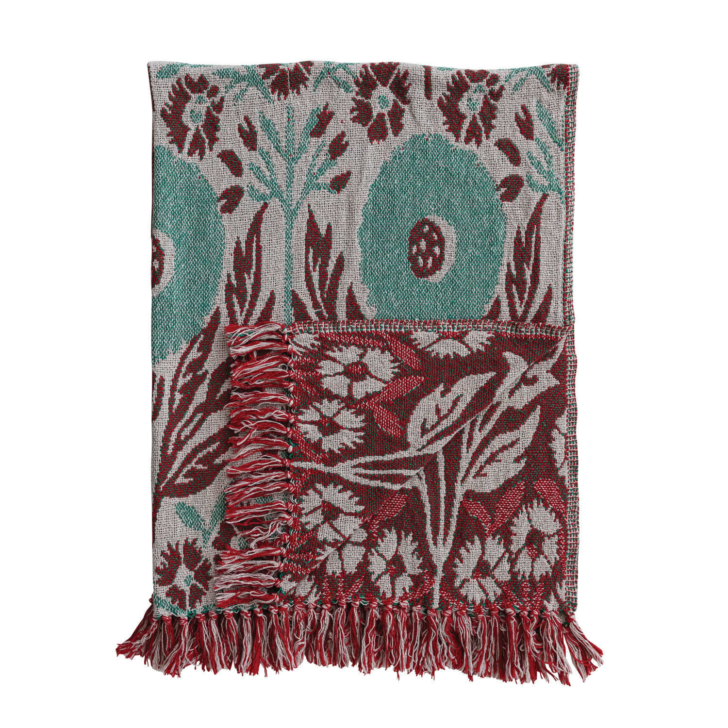 Catalog Name: 60"L x 50"W Woven Cotton Blend Jacquard Throw w/ Flower Pattern & Fringe, Natural, Green & Berry Color