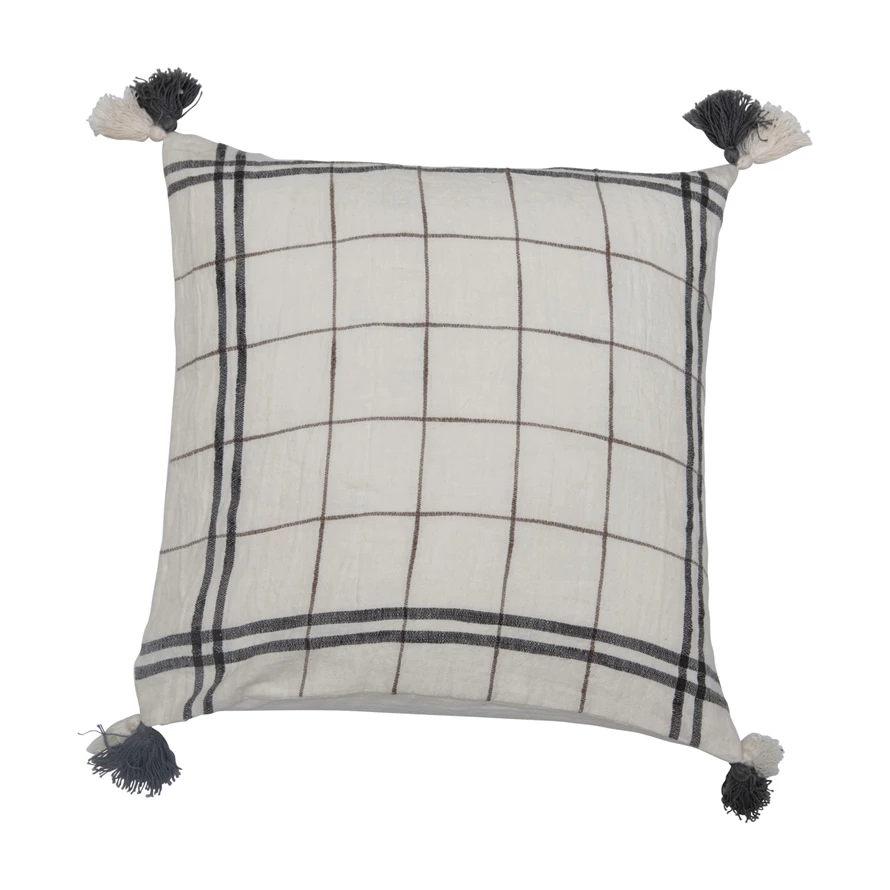 20" Linen Blend Pillow with Grid Pattern & Tassels