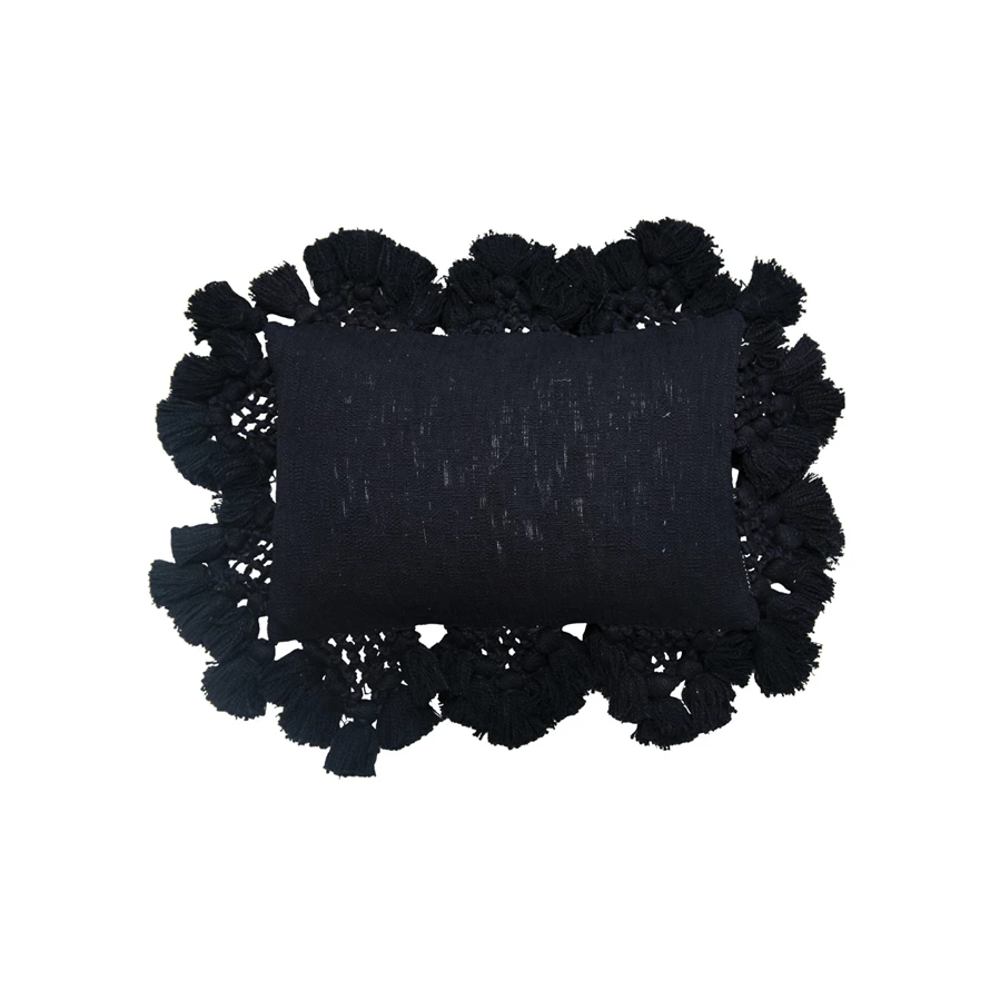 Black cotton slub lumbar pillow with crochet and tassels; Cover: 100% Cotton, Filling: 100% Polyester; 24"L x 16"W x 2"H. Prop 65 Compliant. Machine Wash Cold With Mesh Bag.