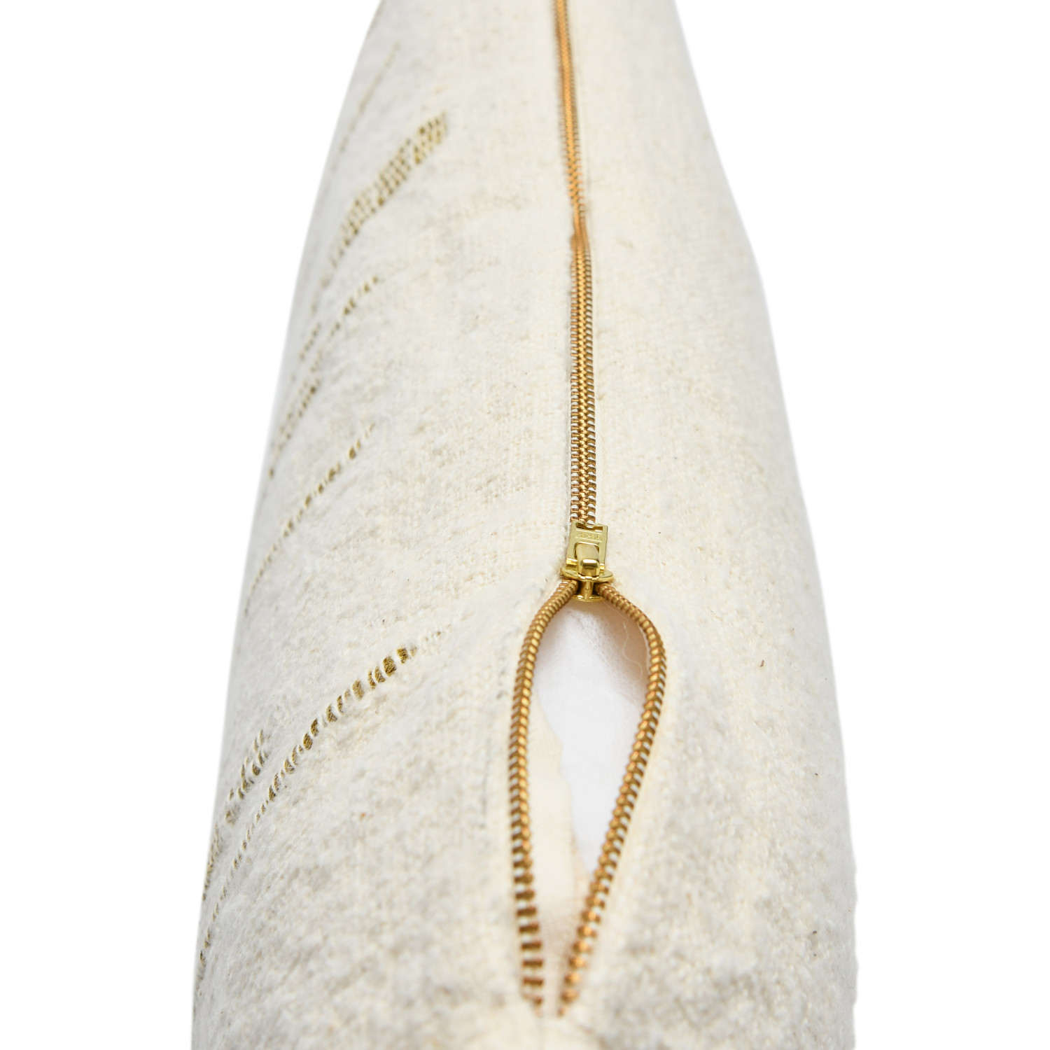 This contemporary lumbar pillow cover features soft cotton slub construction with gold metallic thread embroidery. Cream cotton lumbar pillow with gold metallic thread embroidery; Cream cotton encasement on back. Express your constantly evolving style with the simple addition of this eye-catching pillow. Removable cotton throw pillow cover with polyester insert; Hidden in seam zipper closure; Dry clean only.