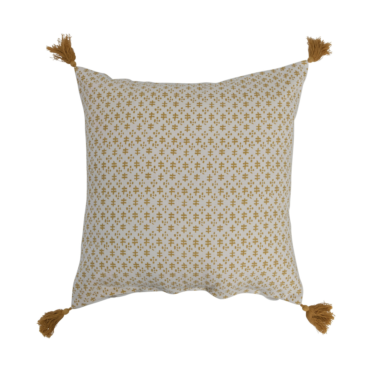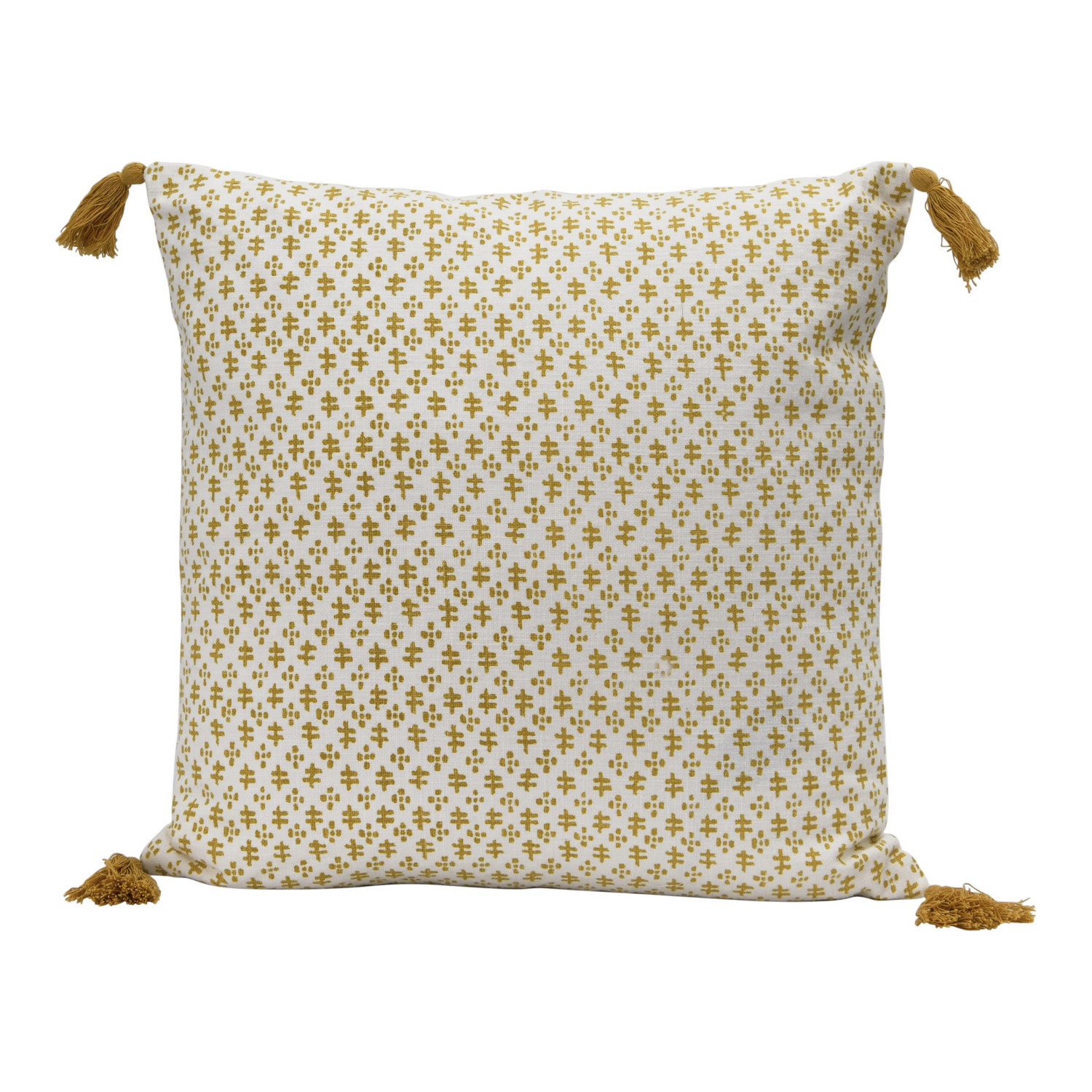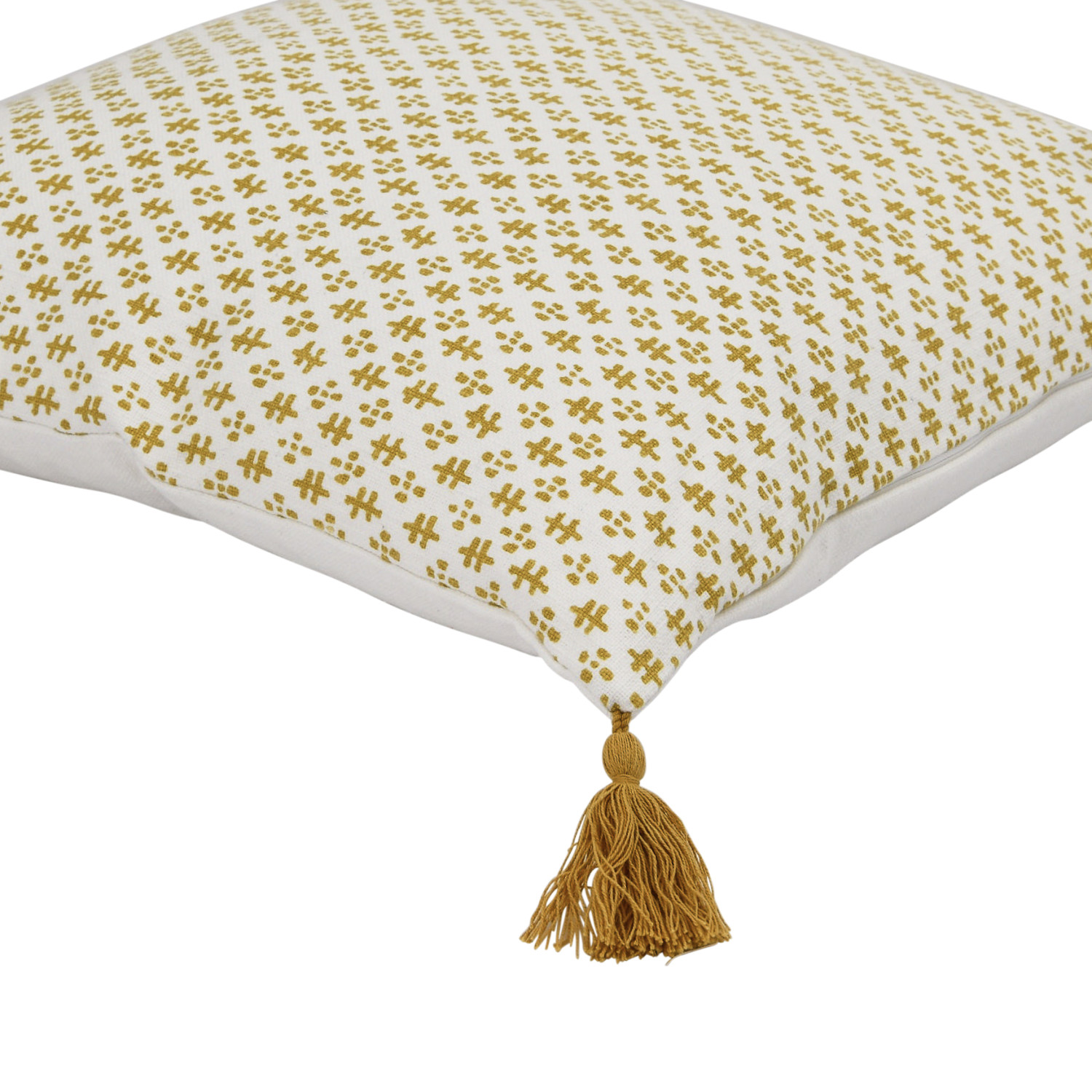 This playful cotton throw pillow cover features a delicate geometric print on soft woven cotton, finished with decorative tassels. Cream and mustard cotton throw pillow with geometric pattern and tassels; Cream cotton encasement on back. Express your constantly evolving style with the simple addition of this eye-catching pillow. Removable throw pillow cover with polyester insert; Hidden in seam zipper closure; 30 degree wash, do not bleach, tumble dry low, do not dry clean, medium iron.