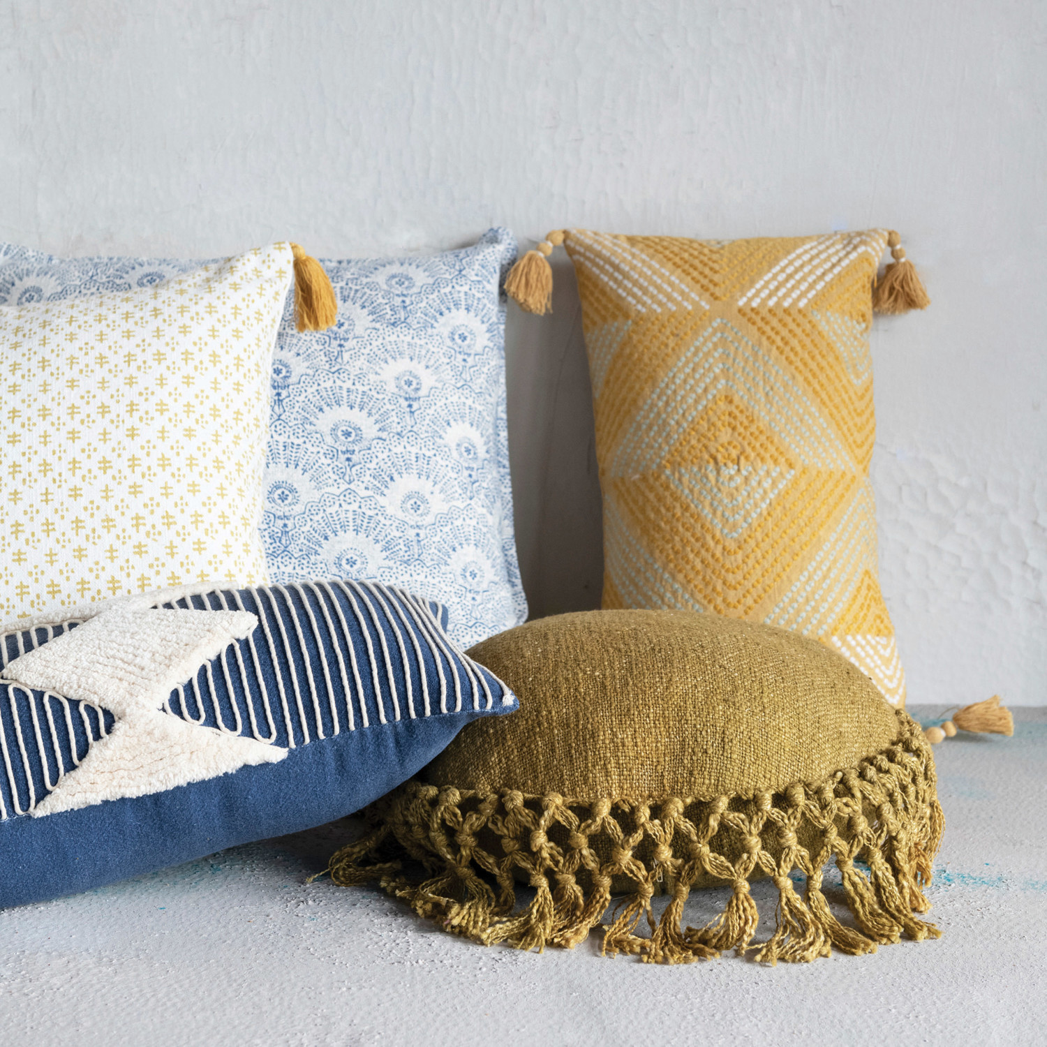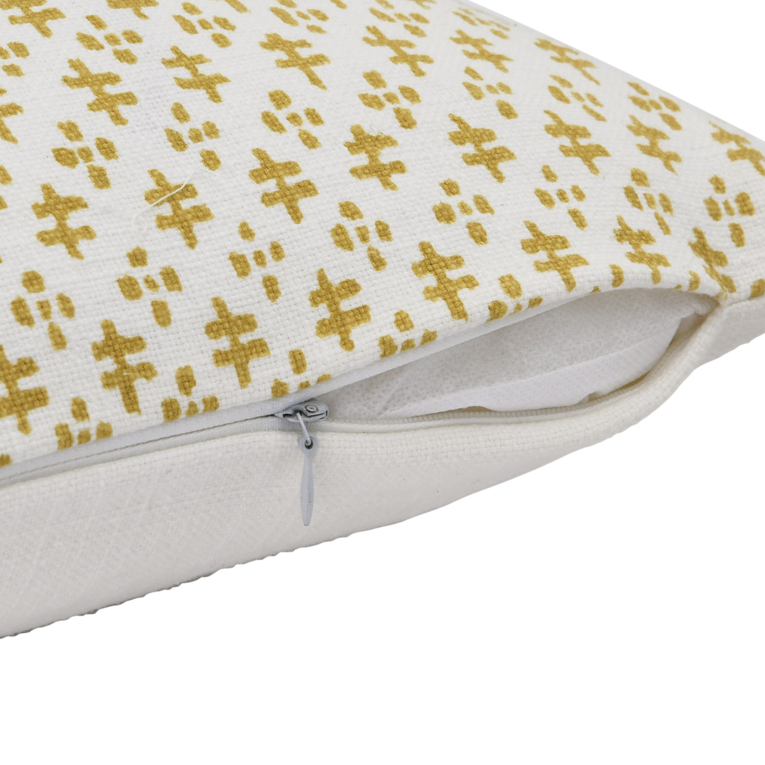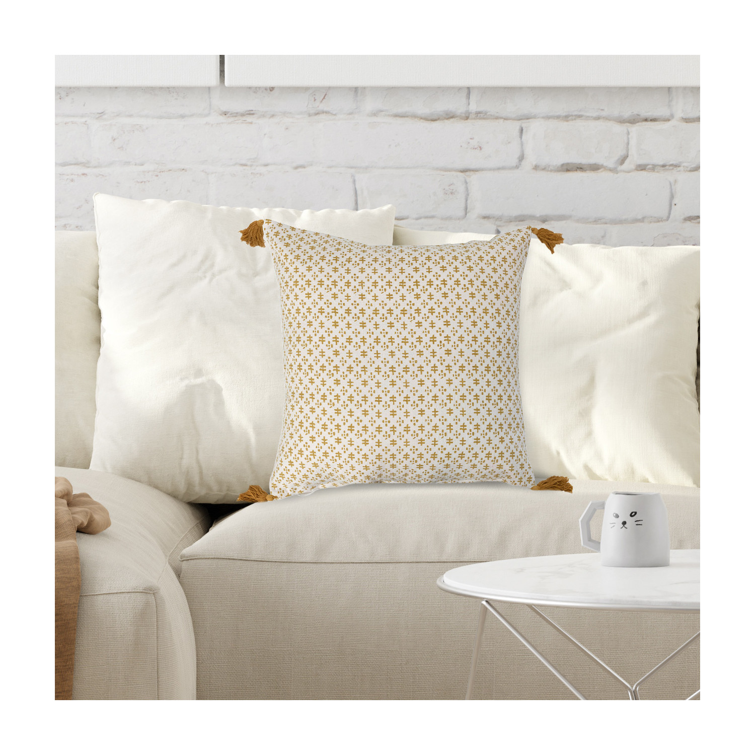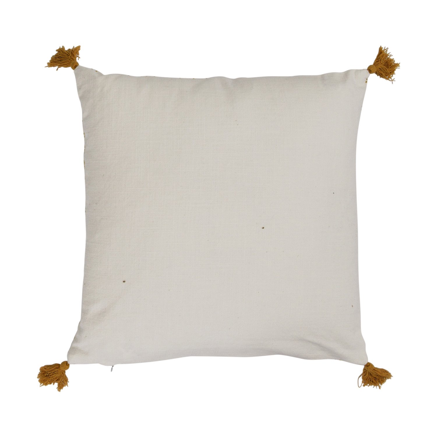 This playful cotton throw pillow cover features a delicate geometric print on soft woven cotton, finished with decorative tassels. Cream and mustard cotton throw pillow with geometric pattern and tassels; Cream cotton encasement on back. Express your constantly evolving style with the simple addition of this eye-catching pillow. Removable throw pillow cover with polyester insert; Hidden in seam zipper closure; 30 degree wash, do not bleach, tumble dry low, do not dry clean, medium iron.