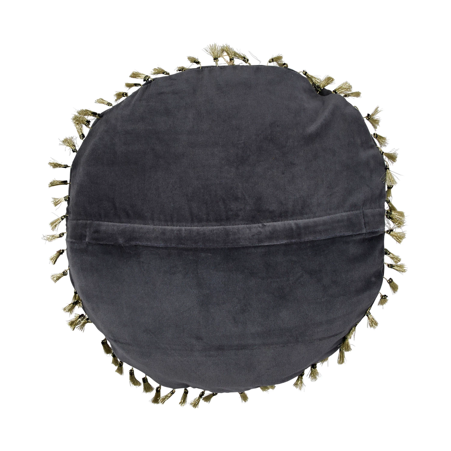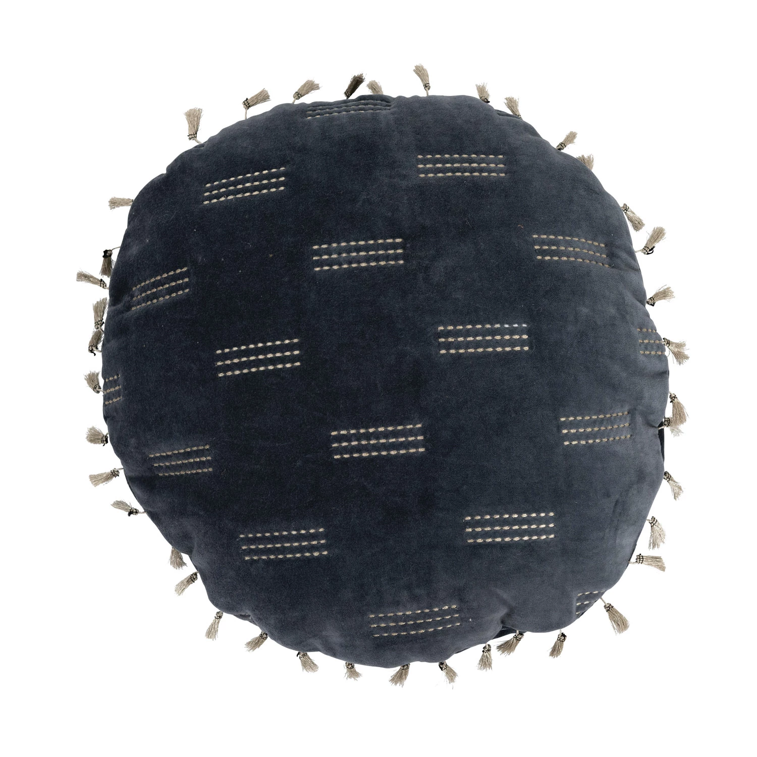 This glamorous throw pillow showcases modern metallic embroidery on luxurious cotton velvet, finished with decorative tassels. Round blue and gold cotton velvet throw pillow with metallic embroidery and tassels; Tonal cotton velvet encasement on back. Express your constantly evolving style with the simple addition of this eye-catching pillow. Removable throw pillow cover and insert; Back zipper with hidden flap; Hand wash cold, do not bleach, warm iron if needed.