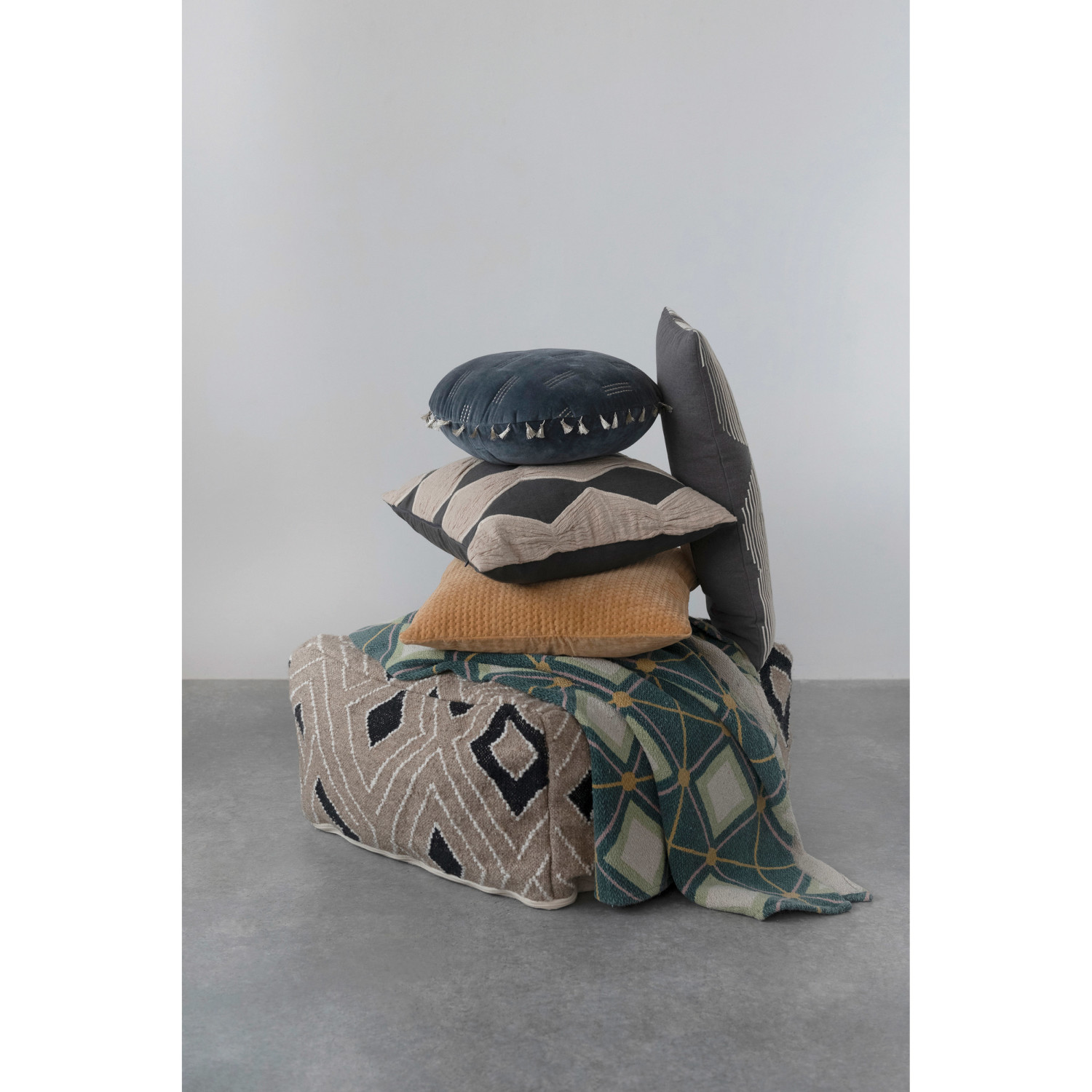 This glamorous throw pillow showcases modern metallic embroidery on luxurious cotton velvet, finished with decorative tassels. Round blue and gold cotton velvet throw pillow with metallic embroidery and tassels; Tonal cotton velvet encasement on back. Express your constantly evolving style with the simple addition of this eye-catching pillow. Removable throw pillow cover and insert; Back zipper with hidden flap; Hand wash cold, do not bleach, warm iron if needed.