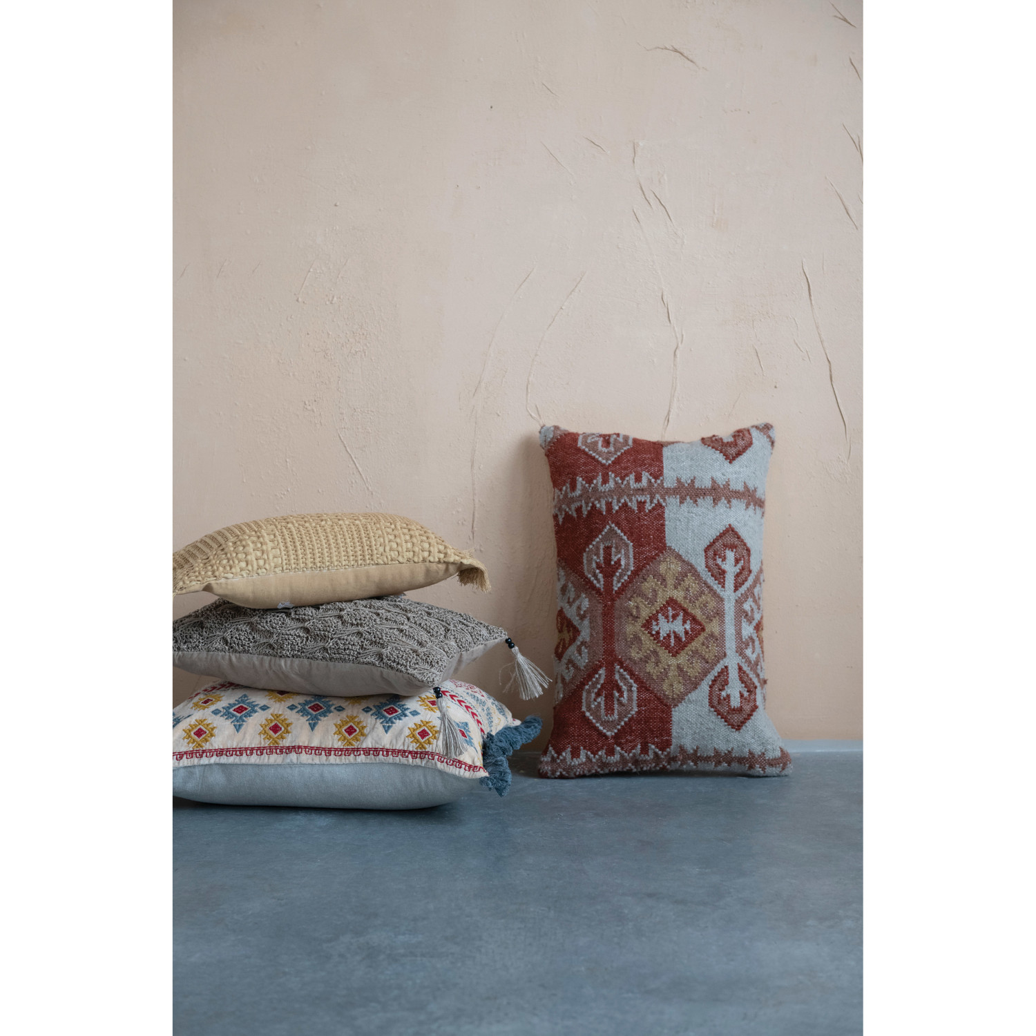 Hand-Woven Cotton and Jute Macrame Lumbar Pillow with Jute Tassels and Mango Wood Beads