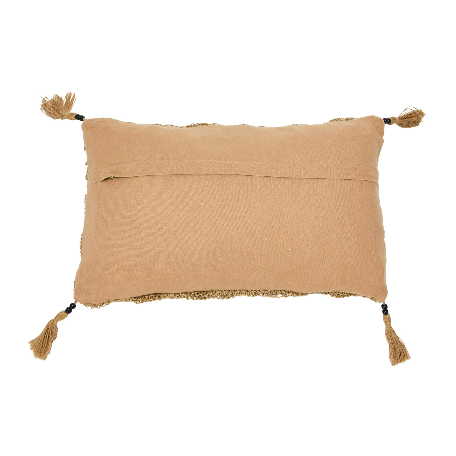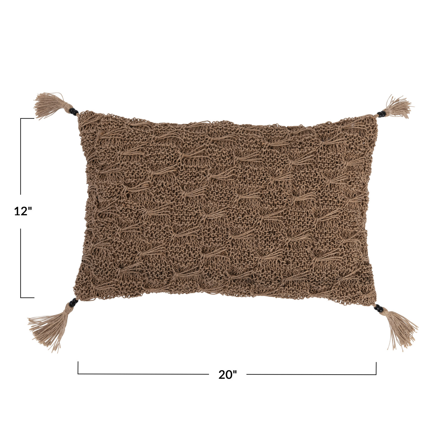 Catalog Name: 20"L x 12"H Cotton & Jute Macrame Lumbar Pillow w/ Jute Tassels & Mango Wood Beads, Brown