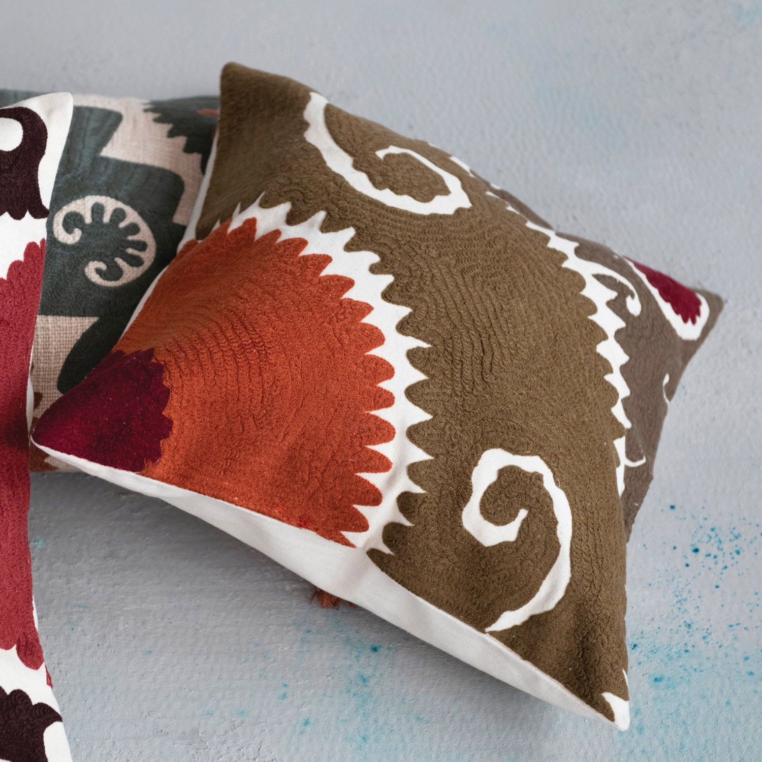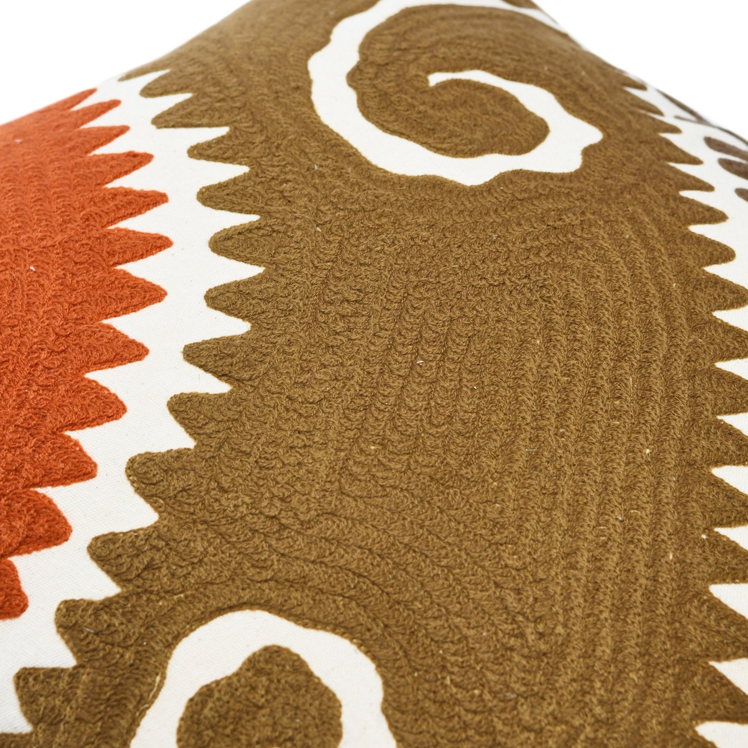 This striking throw pillow cover features a bold embroidered suzani print on durable woven cotton. Multicolor cotton throw pillow with embroidered suzani print; Natural cotton encasement on back. Express your constantly evolving style with the simple addition of this eye-catching pillow. Removable cotton throw pillow cover with polyester insert; Back zipper with hidden flap; Machine wash cold, gentle cycle, do not bleach, tumble dry low, warm iron if needed.