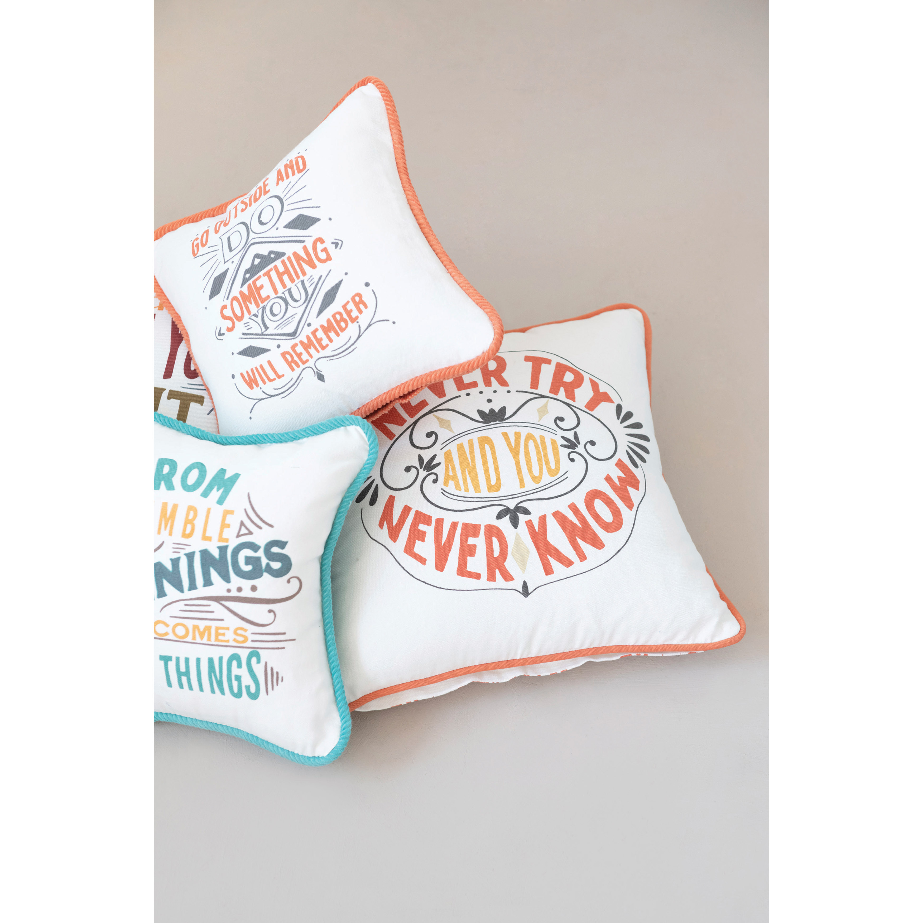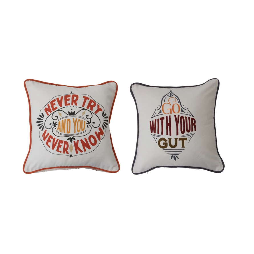 Cotton Pillow with Saying, Piping and Patterned Back, 2 Styles
