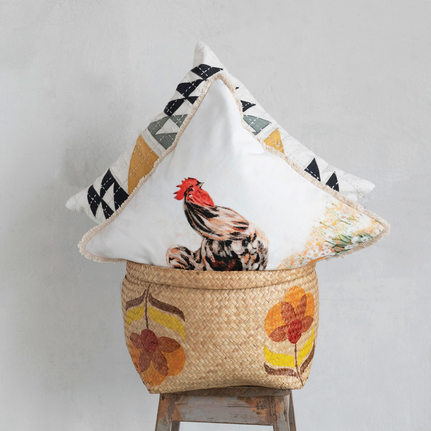 This playful throw pillow cover features a painterly rooster illustration on cotton, finished with delicate eyelash fringe. Multicolor cotton throw pillow with rooster illustration; Natural cotton encasement on back. Express your constantly evolving style with the simple addition of this eye-catching pillow. Removable cotton throw pillow cover with polyester insert; Back zipper with hidden flap; Machine wash cold, gentle cycle, do not bleach, warm iron if needed, trim and comb edges after washing.