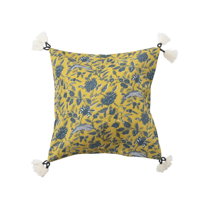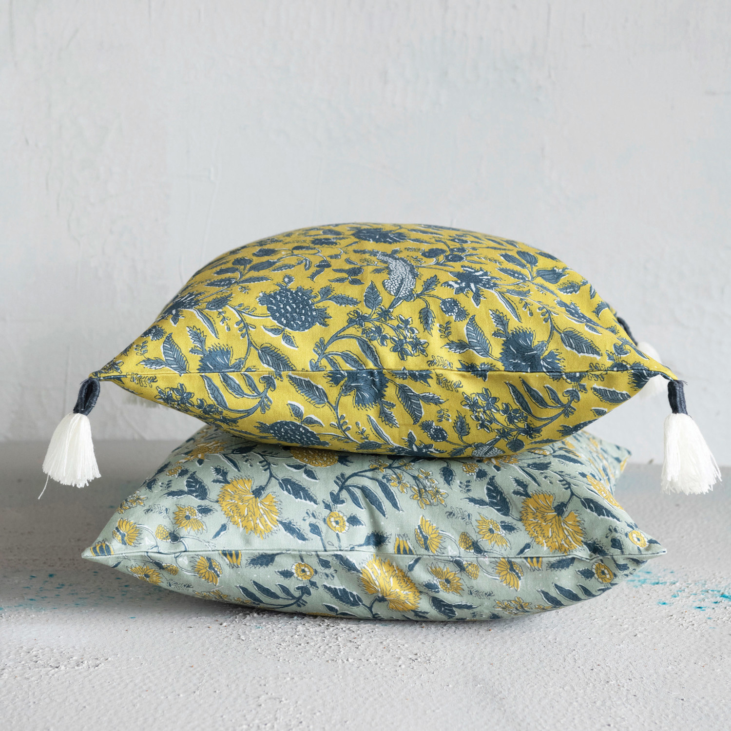 Catalog Name: 18" Square Cotton Pillow w/ Floral Pattern & Yarn-Wrapped Tassels, Blue, Chartreuse & White