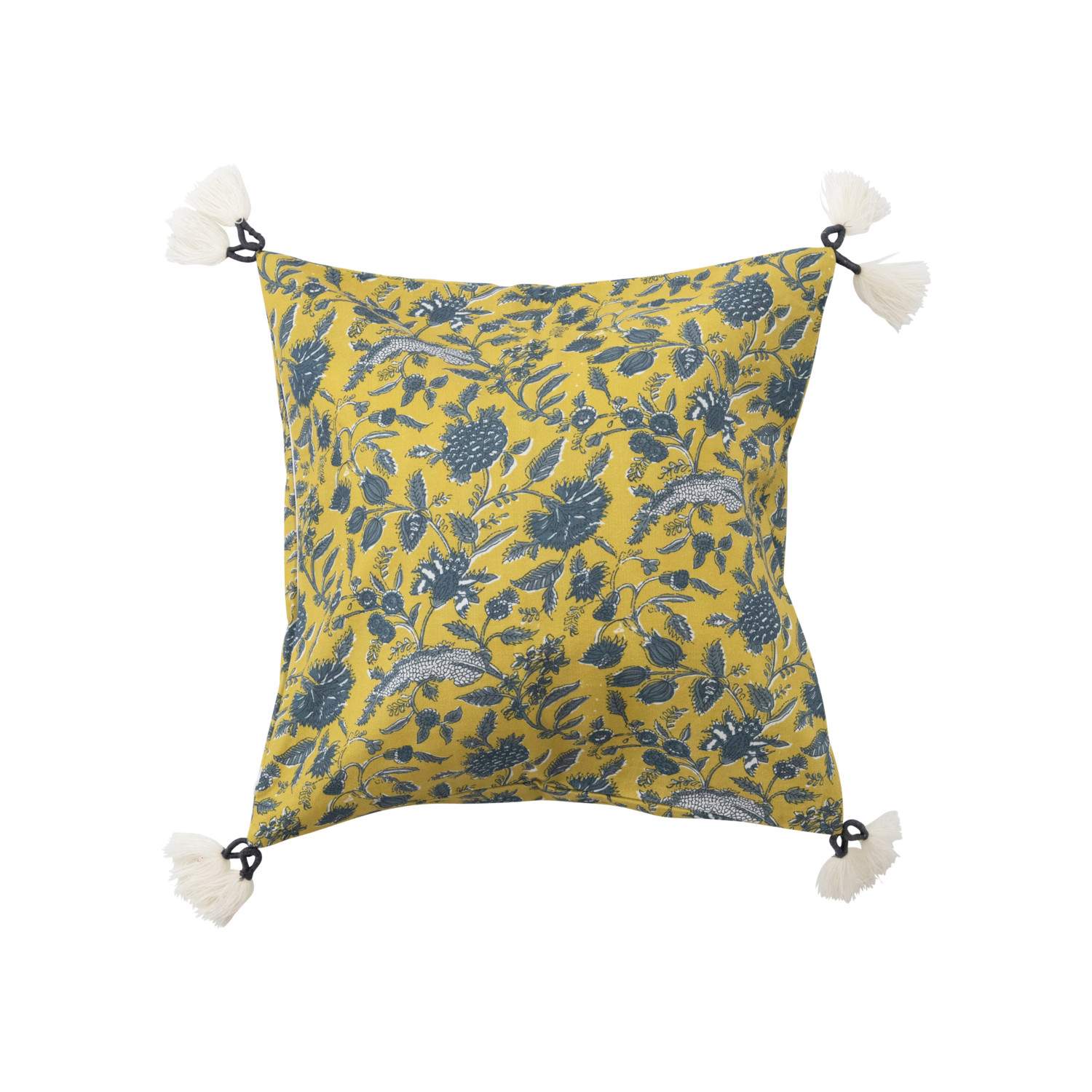 This whimsically farmhouse throw pillow cover features a bold floral pattern on cotton, finished with decorative yarn-wrapped tassels. Square blue, chartreuse, and white cotton throw pillow with floral print and yarn-wrapped tassels. Express your constantly evolving style with the simple addition of this eye-catching pillow. Removable cotton throw pillow cover with polyester insert; Hidden in seam zipper closure; Machine wash warm, gentle cycle, do not bleach; Tumble dry low, warm iron if needed or hand wash.