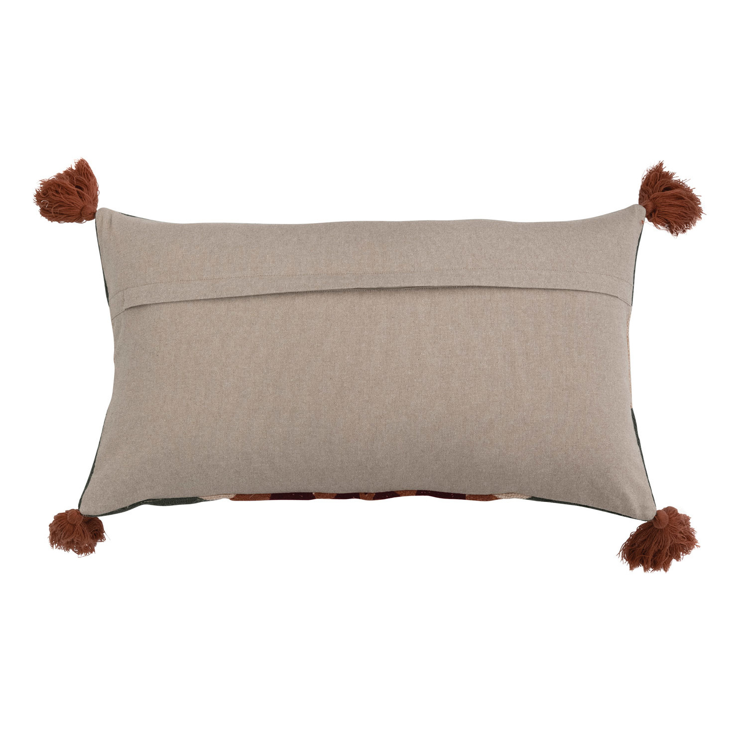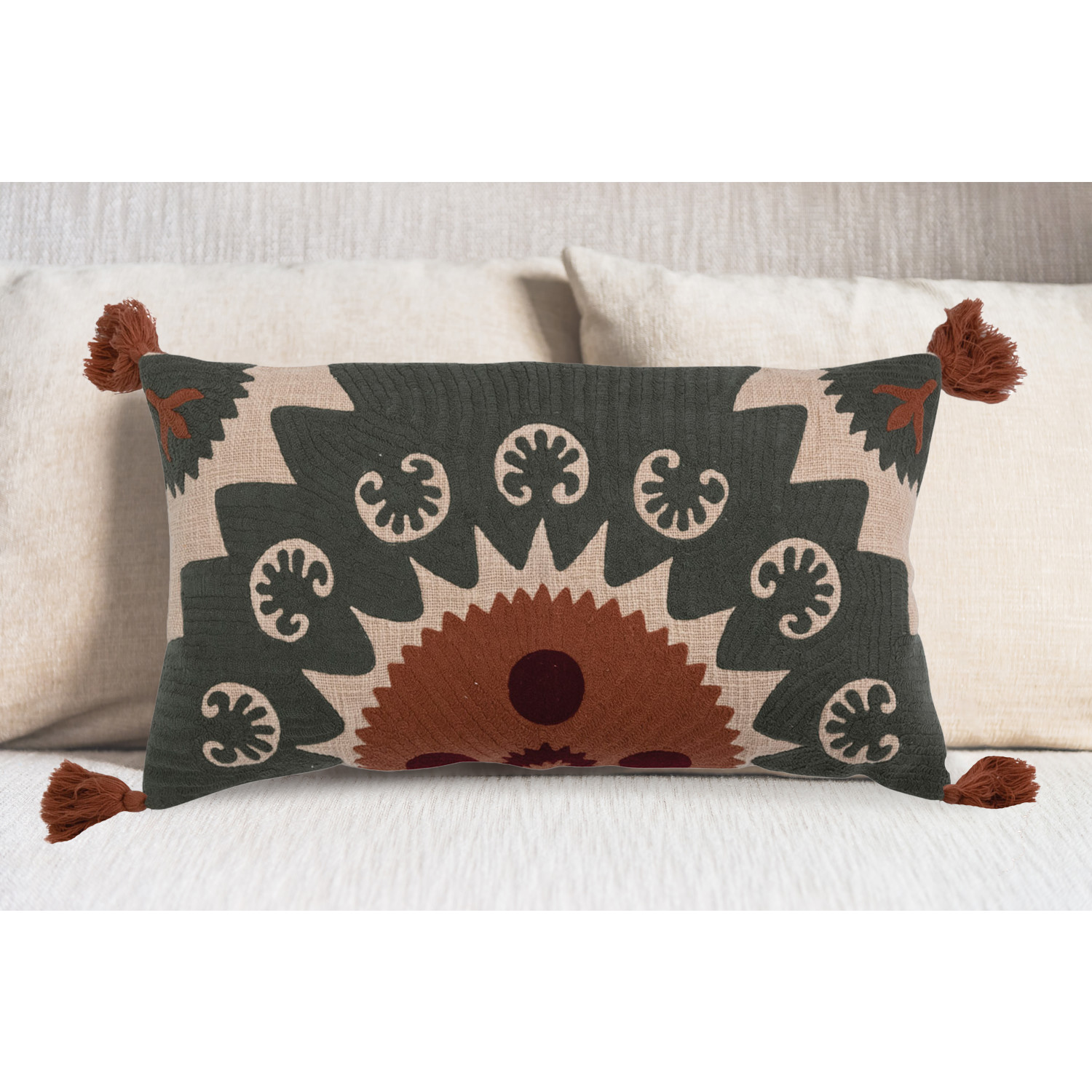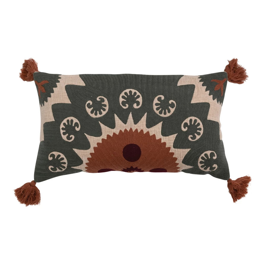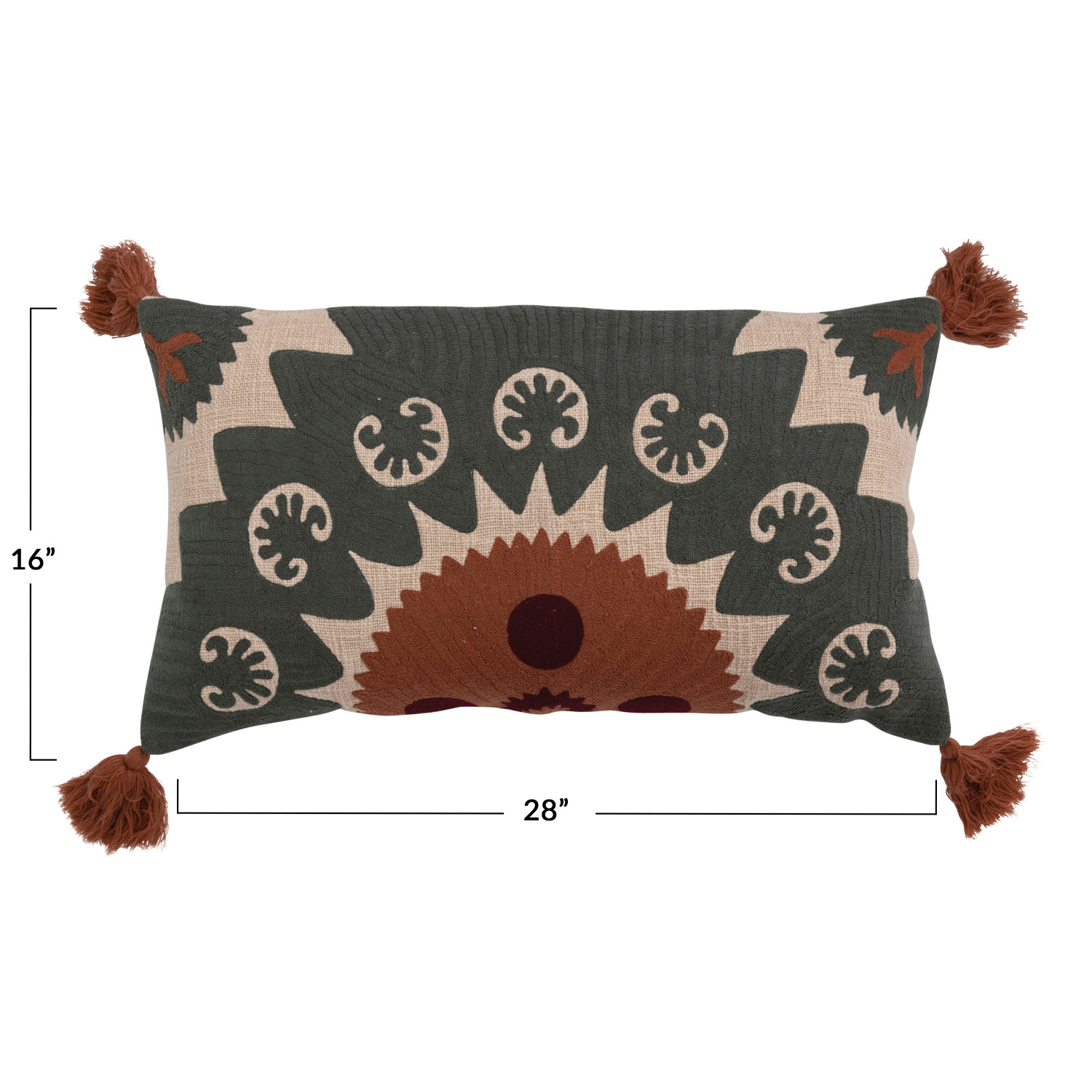 28" x 16" Cotton Lumbar Pillow with Suzani Embroidery & Tassels