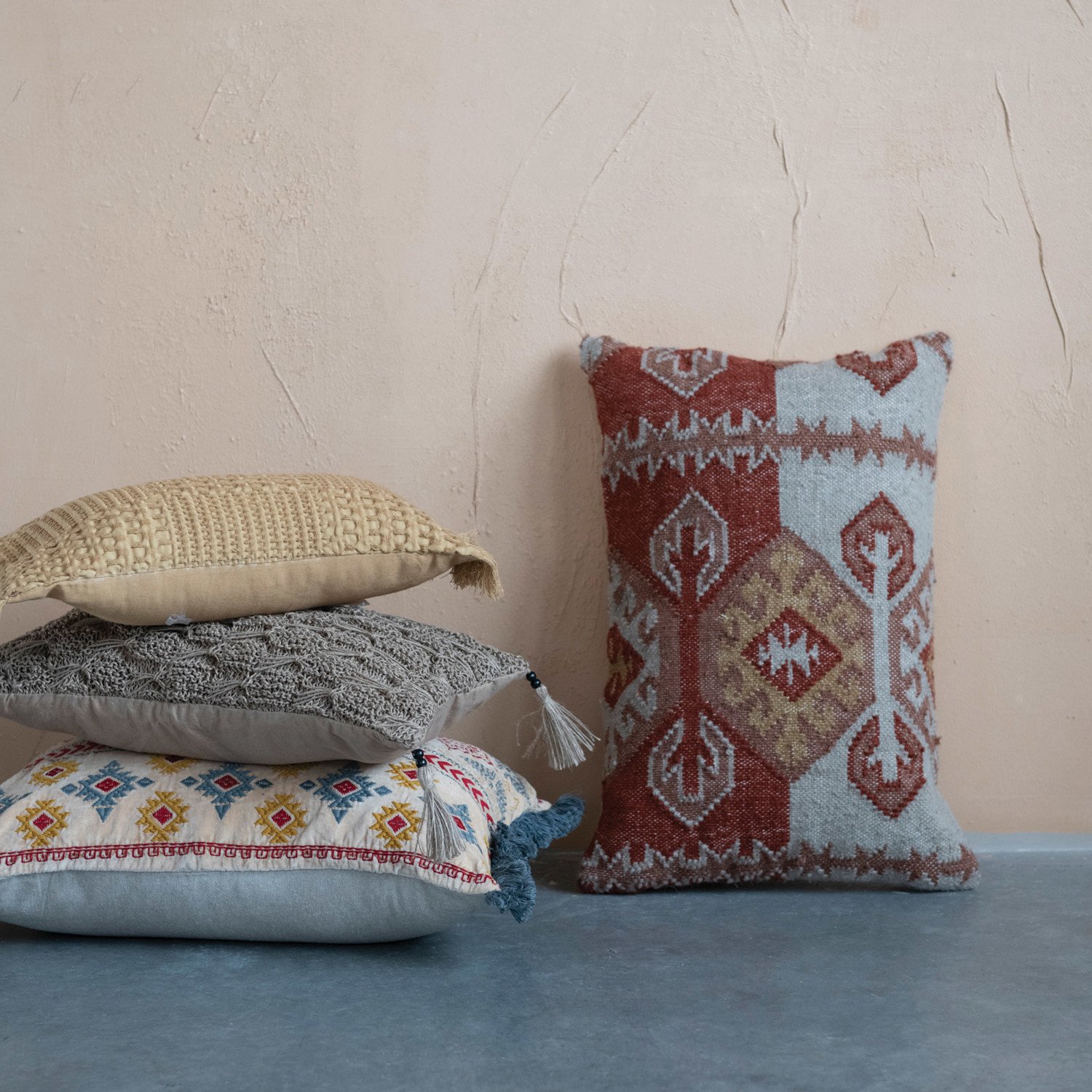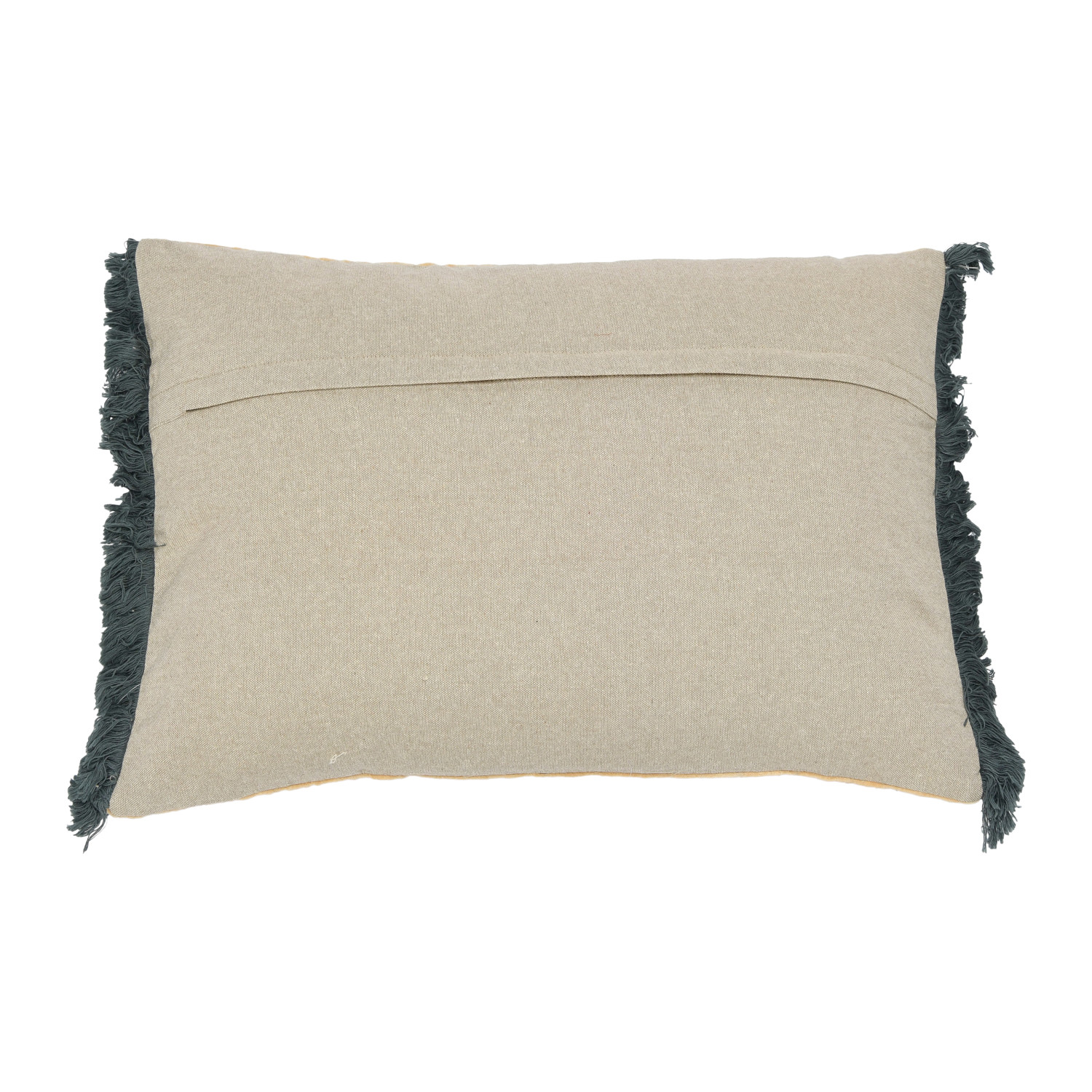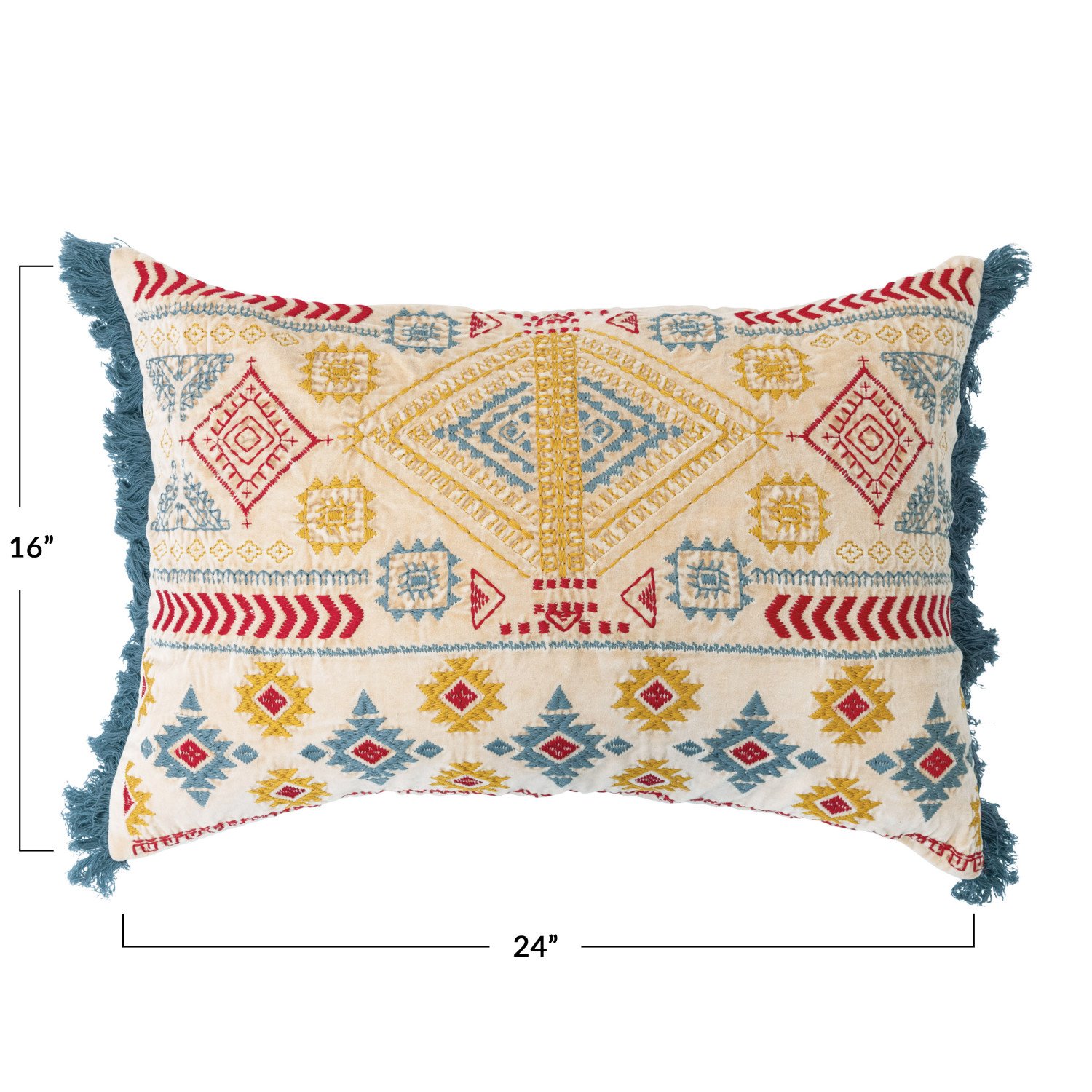 This southwestern-inspired lumbar pillow cover showcases multicolor geometric embroidery on luxurious cotton velvet, finished with delicate fringe. Square multicolor cotton velvet lumbar pillow with southwestern embroidery and fringe detail; Natural cotton velvet encasement on back. Express your constantly evolving style with the simple addition of this eye-catching pillow. Removable cotton lumbar pillow cover with polyester insert; Back zipper with hidden flap; Machine wash.