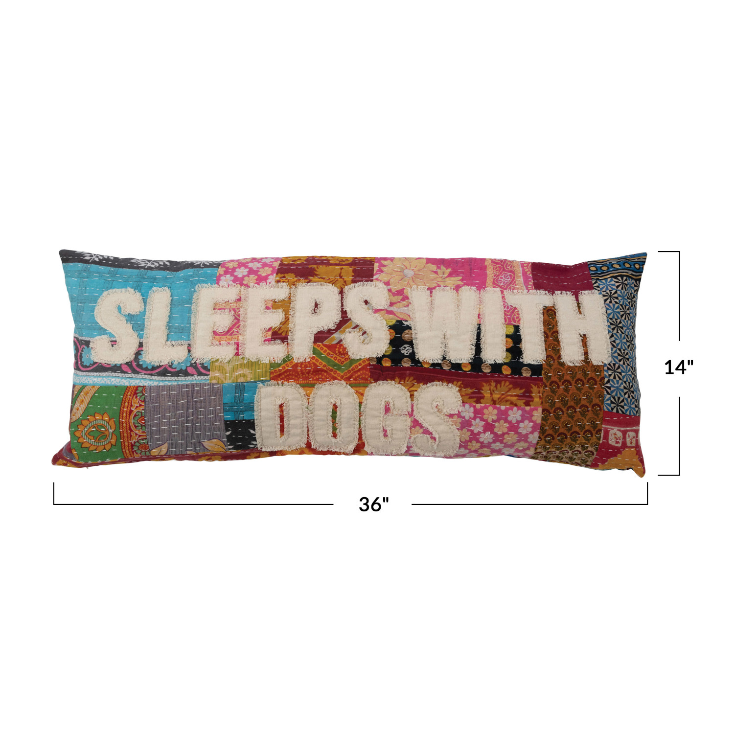 Catalog Name: 36"L x 14"H Vintage Kantha Patchwork Lumbar Pillow "Sleeps with Dogs", Multi Color (Each One Will Vary)