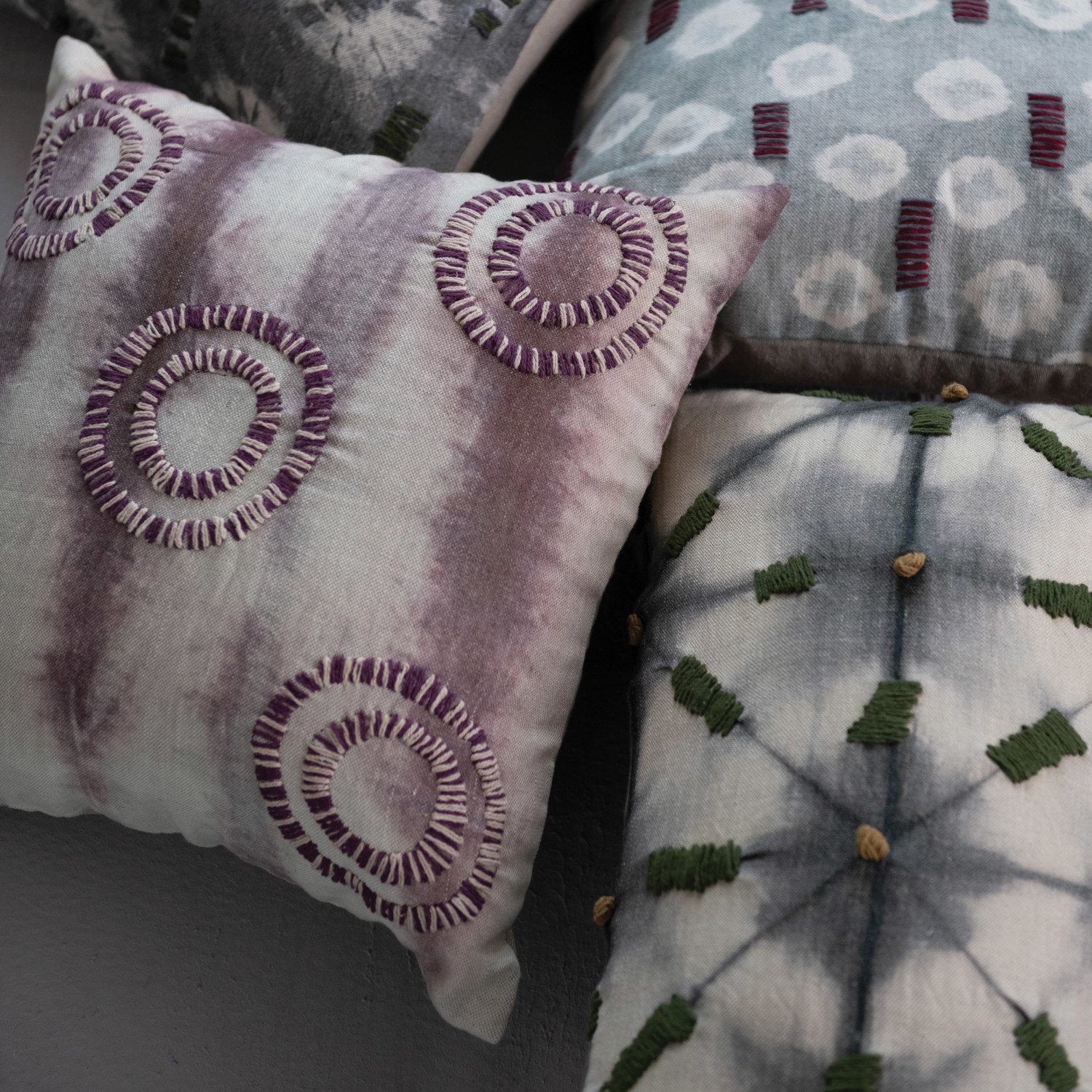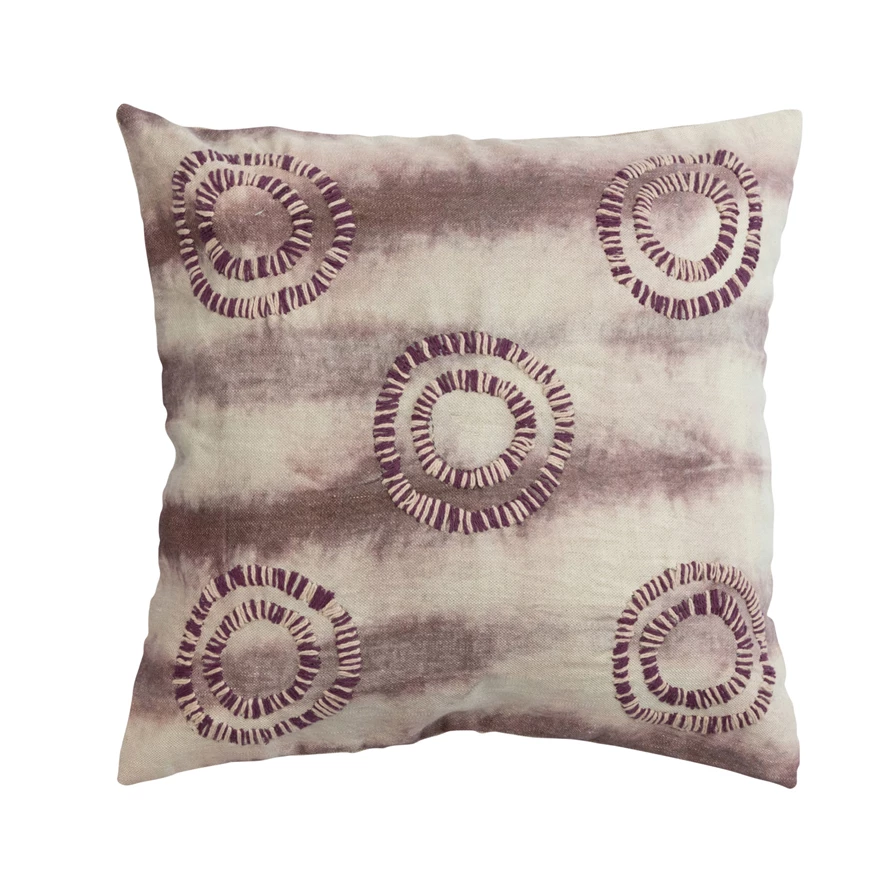 Catalog Name: 18" Square Linen Printed Pillow w/ Hand-Embroidery & Chambray Back, Cream & Plum Color
