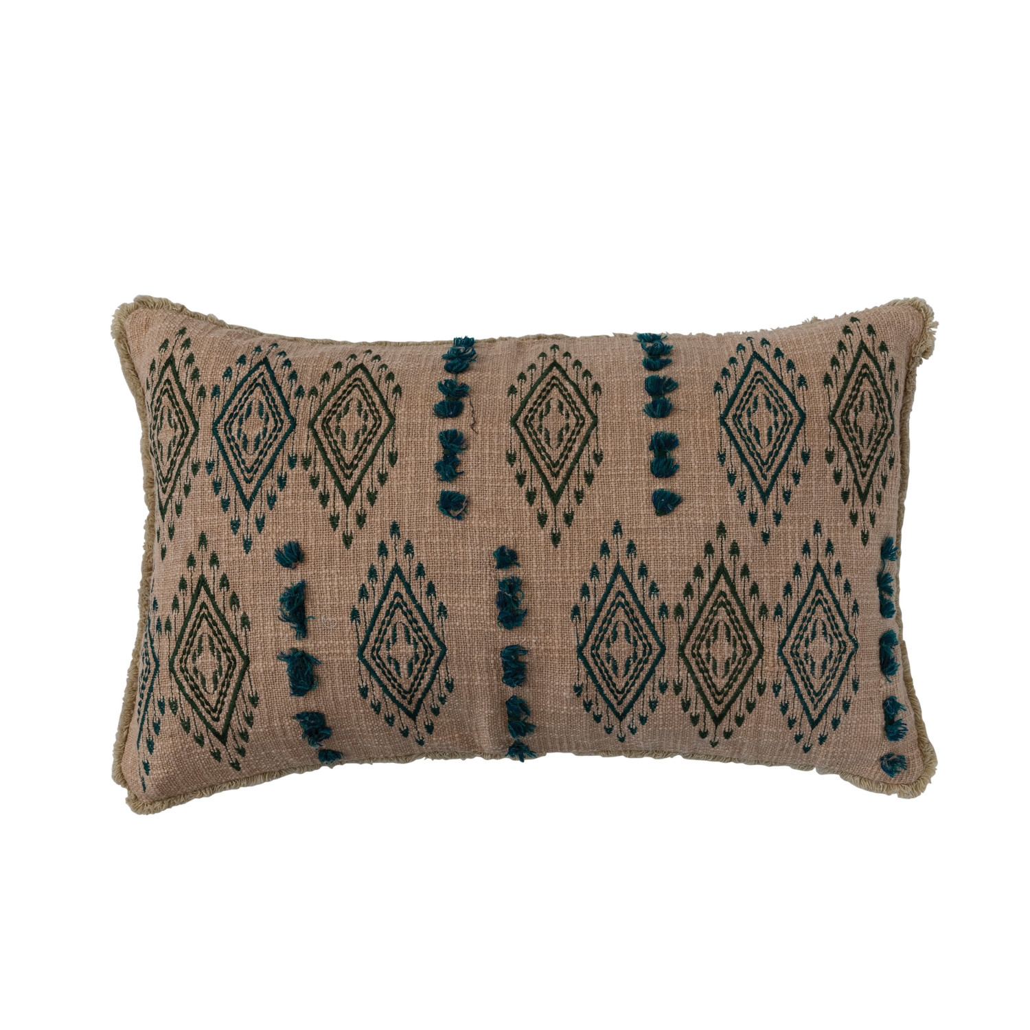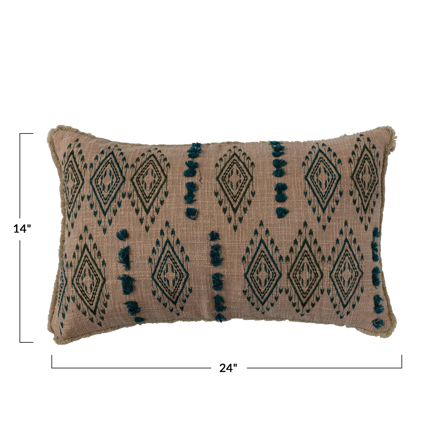 Catalog Name: 24"L x 14"H Cotton Slub Lumbar Pillow w/ Embroidered Pattern & Fringe, Natural & Teal