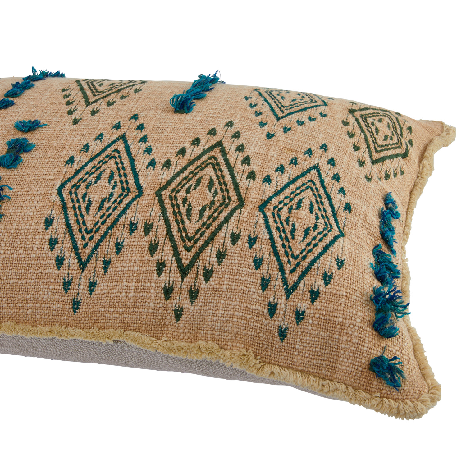 Cotton Slub Lumbar Pillow w/ Embroidered Pattern & Fringe, Natural & Teal