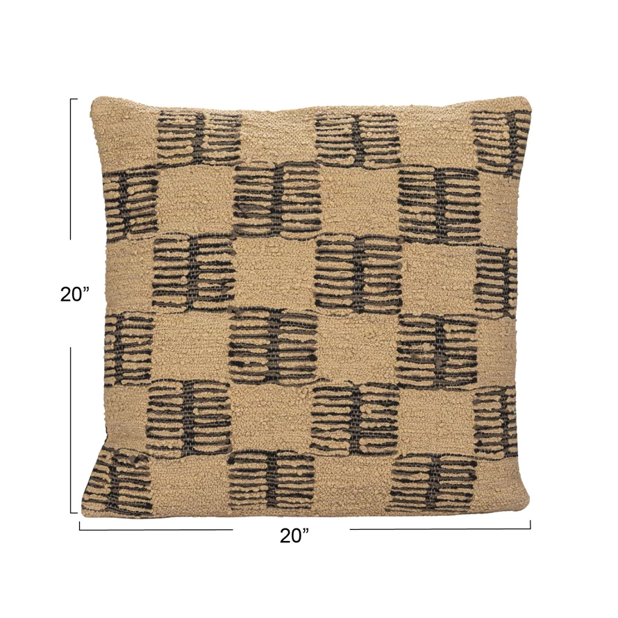 This hand-woven fabric indoor/outdoor pillow features a brown and tan checkered pattern, providing a natural and rustic look. The fabric's subtle texture adds personality to the decor. The pillow is made of polyester for both the cover and fill, making it soft and comfortable. It is suitable for indoor and outdoor use, able to withstand different weather conditions. The pillow measures 20 inches in length and 20 inches in width, making it suitable for most sofas, chairs, or beds. It can add a touch of farmhouse, cottagecore, boho, transitional, or modern style to any space. This versatile accessory is perfect for decorating living rooms, bedrooms, patios, or any other room.