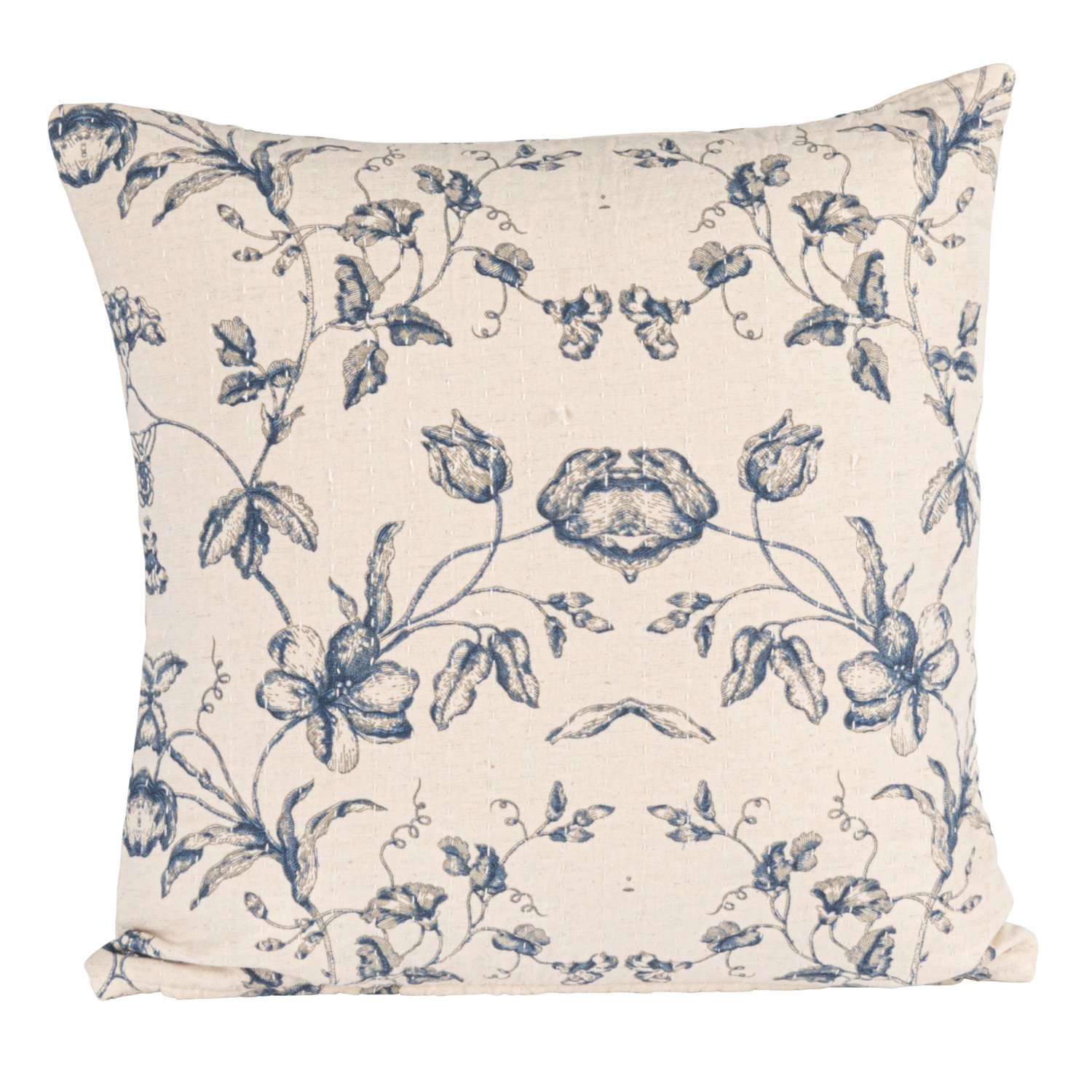 Catalog Name: 18" Square Cotton & Linen Printed Pillow w/ Floral Pattern, Hand-Embroidered Kantha Stitch & Chambray Back, Natural & Blue (Each One Will Vary)