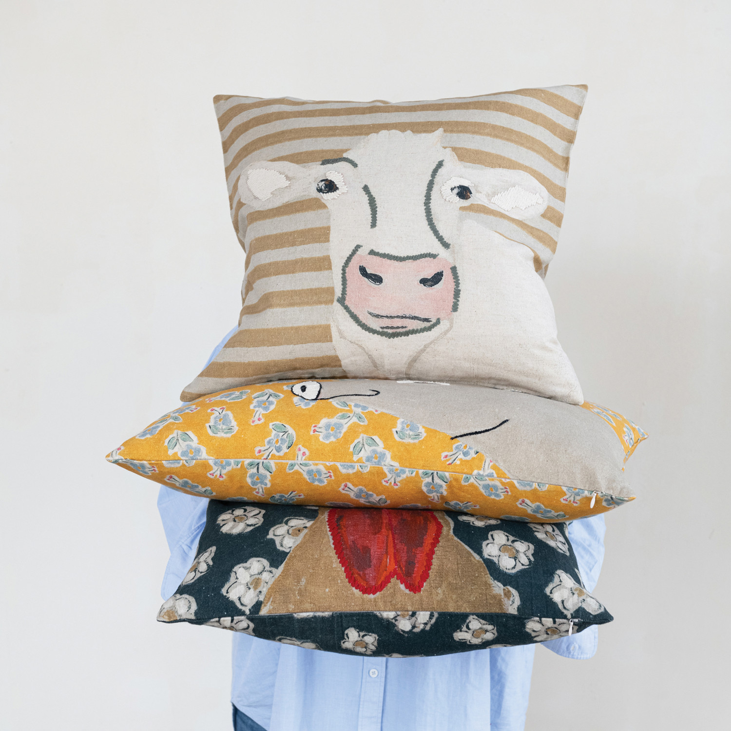 20" Square Cotton & Linen Pillow with Cow Image & Embroidery ©