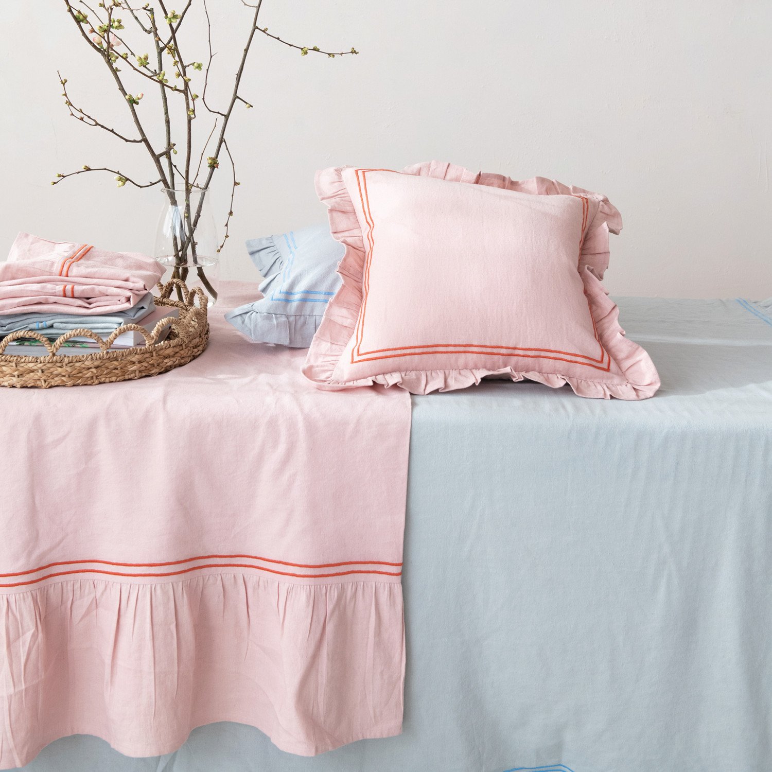 Cotton & Linen Pillow w/ Embroidered Stripes & Ruffle, Blue