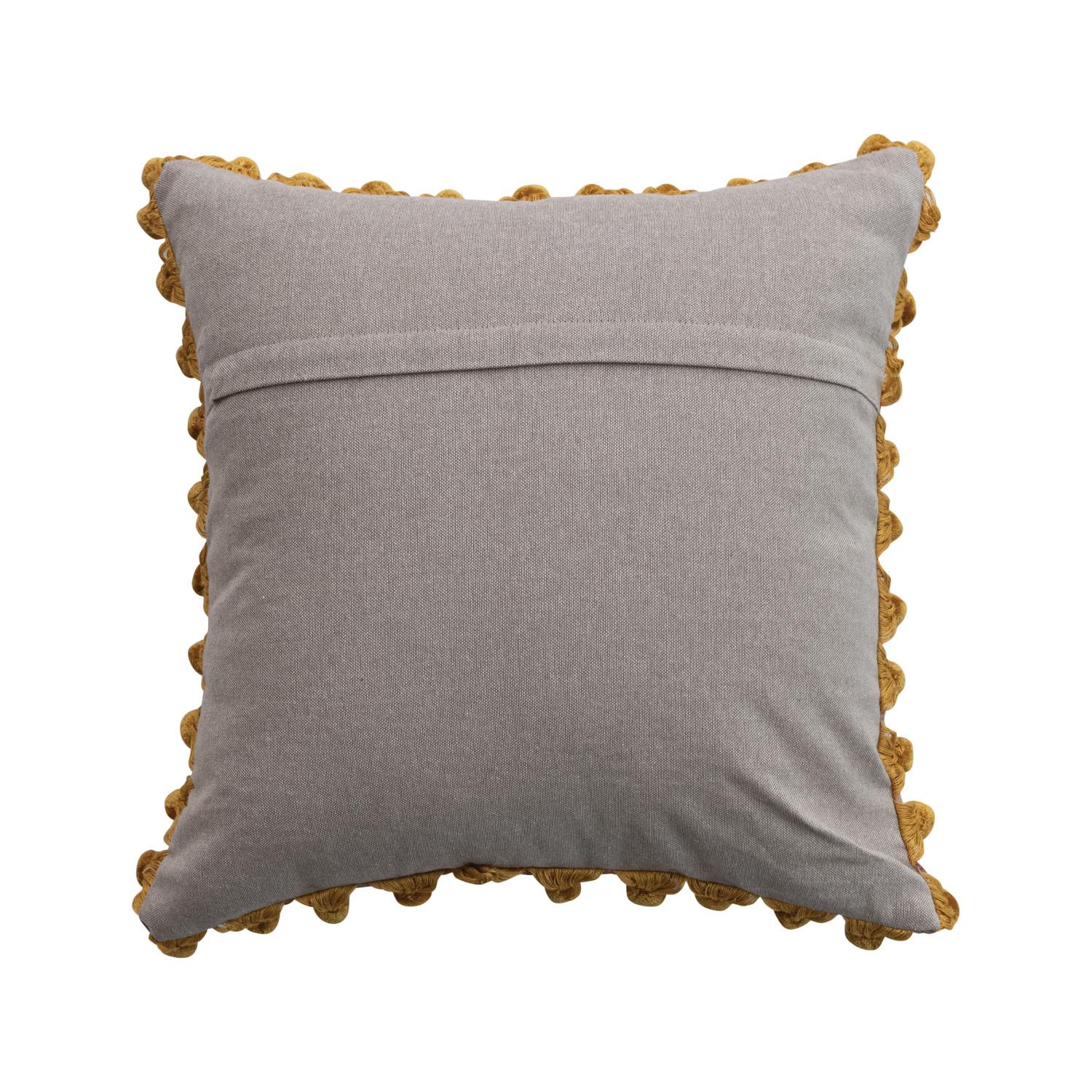 Catalog Name: 18" Square Velvet Printed Pillow w/ Hand-Embroidered Kantha Stitch, Pom Poms & Chambray Back, Multi Color