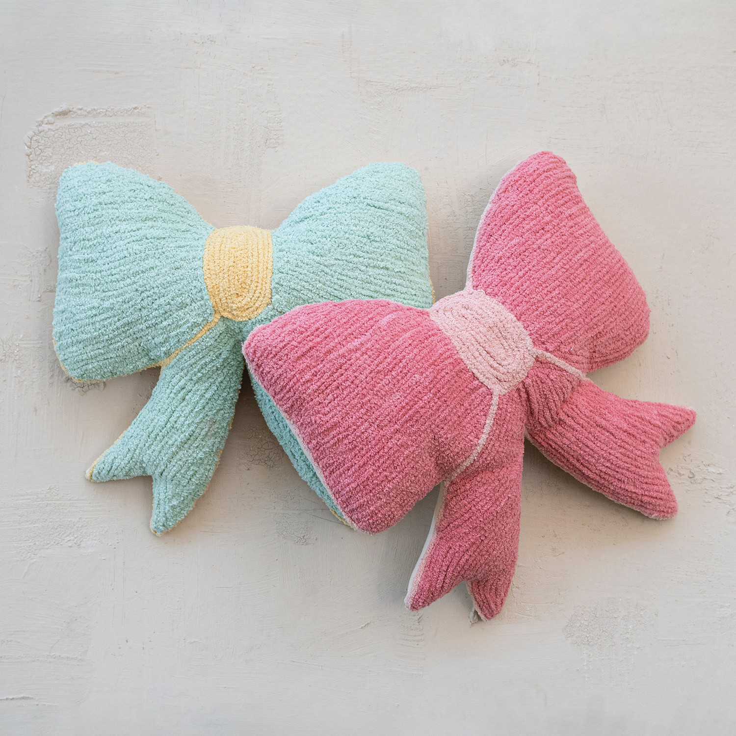 Catalog Name: 16"L x 16"H Woven Cotton Chenille Bow Shaped Pillow w/ Cotton Back, Pink & Light Pink